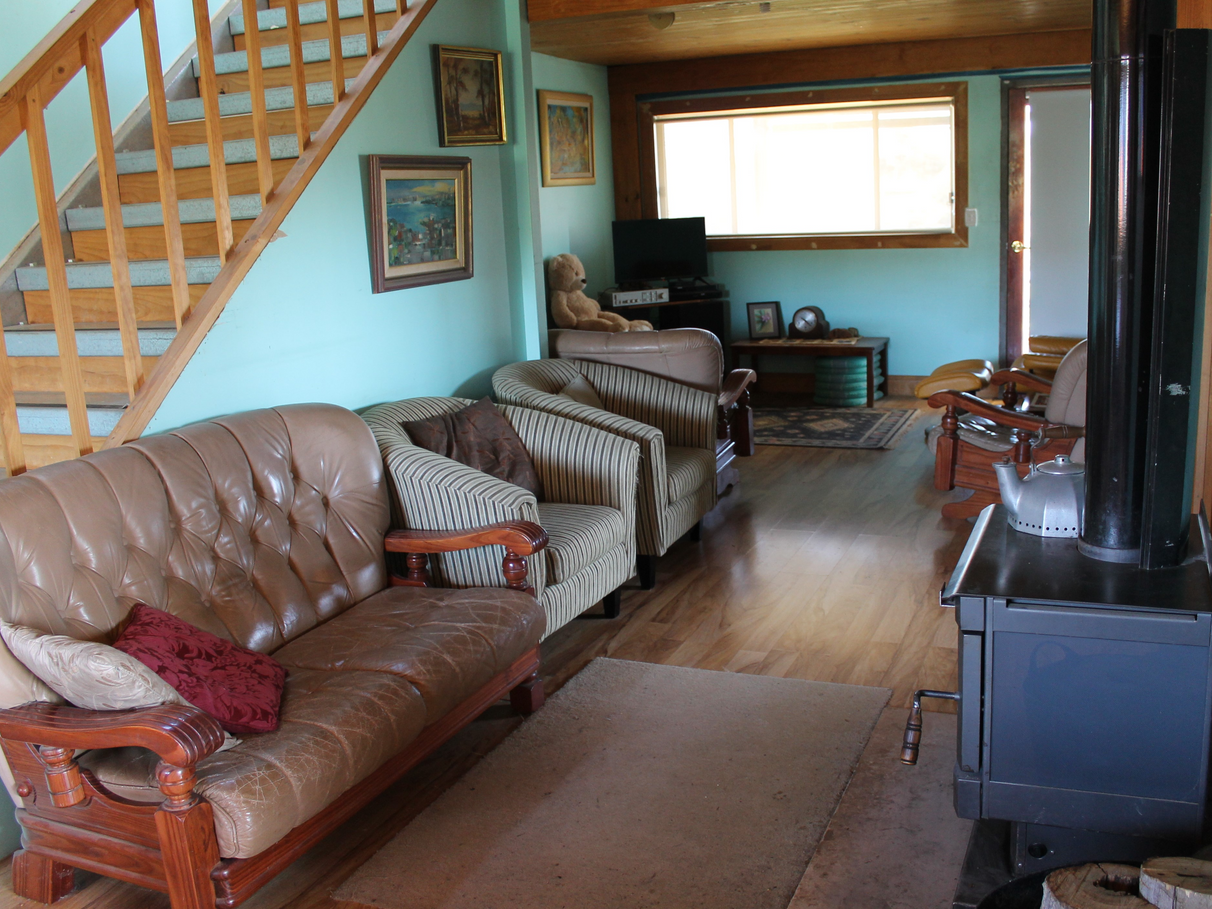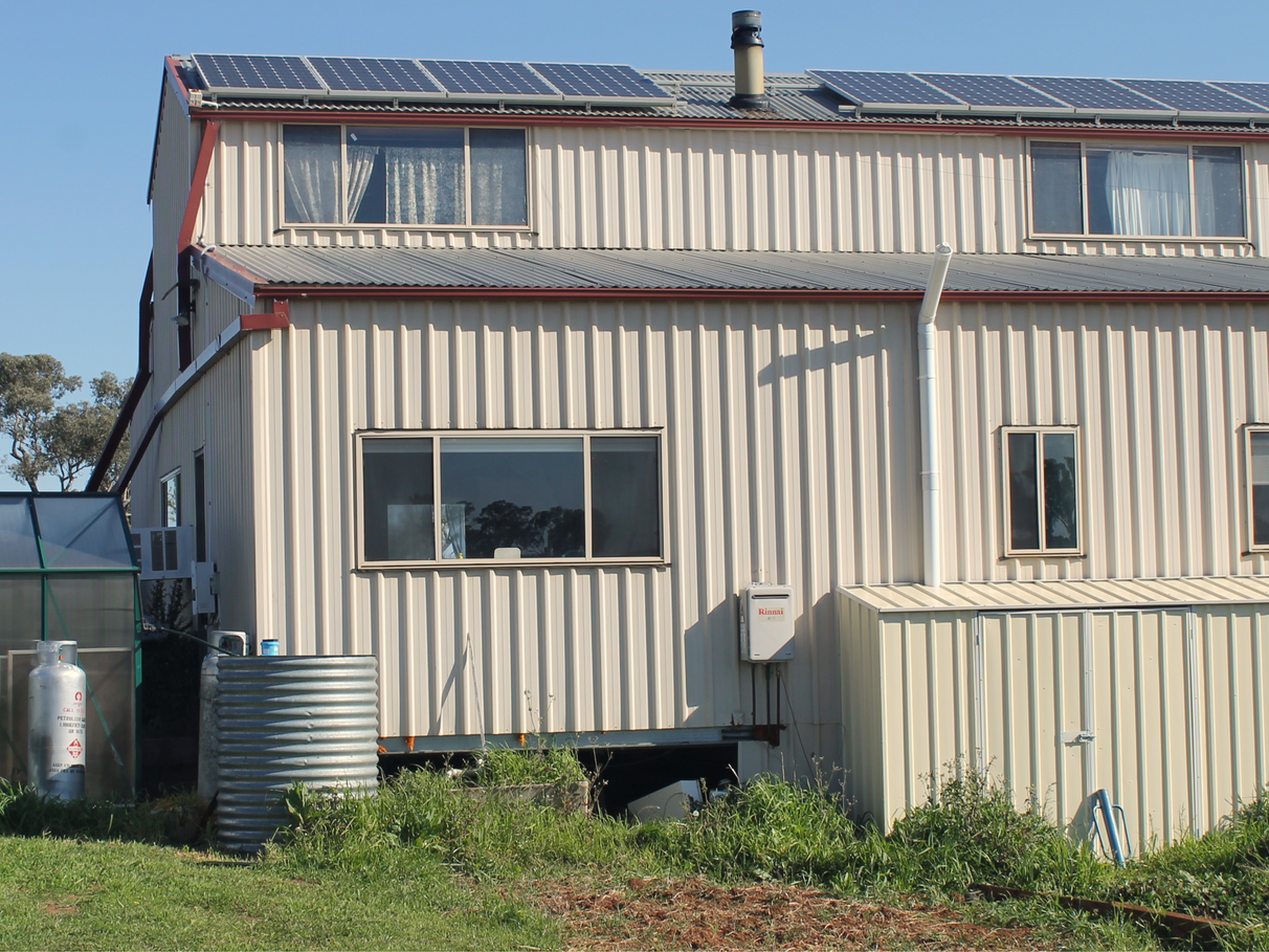 The 2 storey fully insulated American Barn style house has 4 bedrooms and an office, and is partly unfinished. The open plan kitchen/dining/lounge area is heated by a slow combustion wood stove and cooled with an air conditioner. The kitchen features a walk-in pantry and gas cooktop and oven. Satellite internet via Skymuster is connected to the office. Efficiency and sustainability are highlighted with a 3kVa solar grid connected system, gas instant hot water and waterless composting toilets.