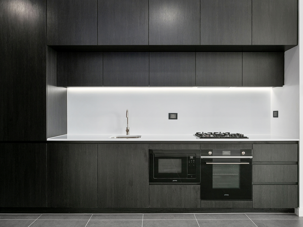 - Sleek single wall kitchen with generous storage space, gas cooking and integrated dishwasher