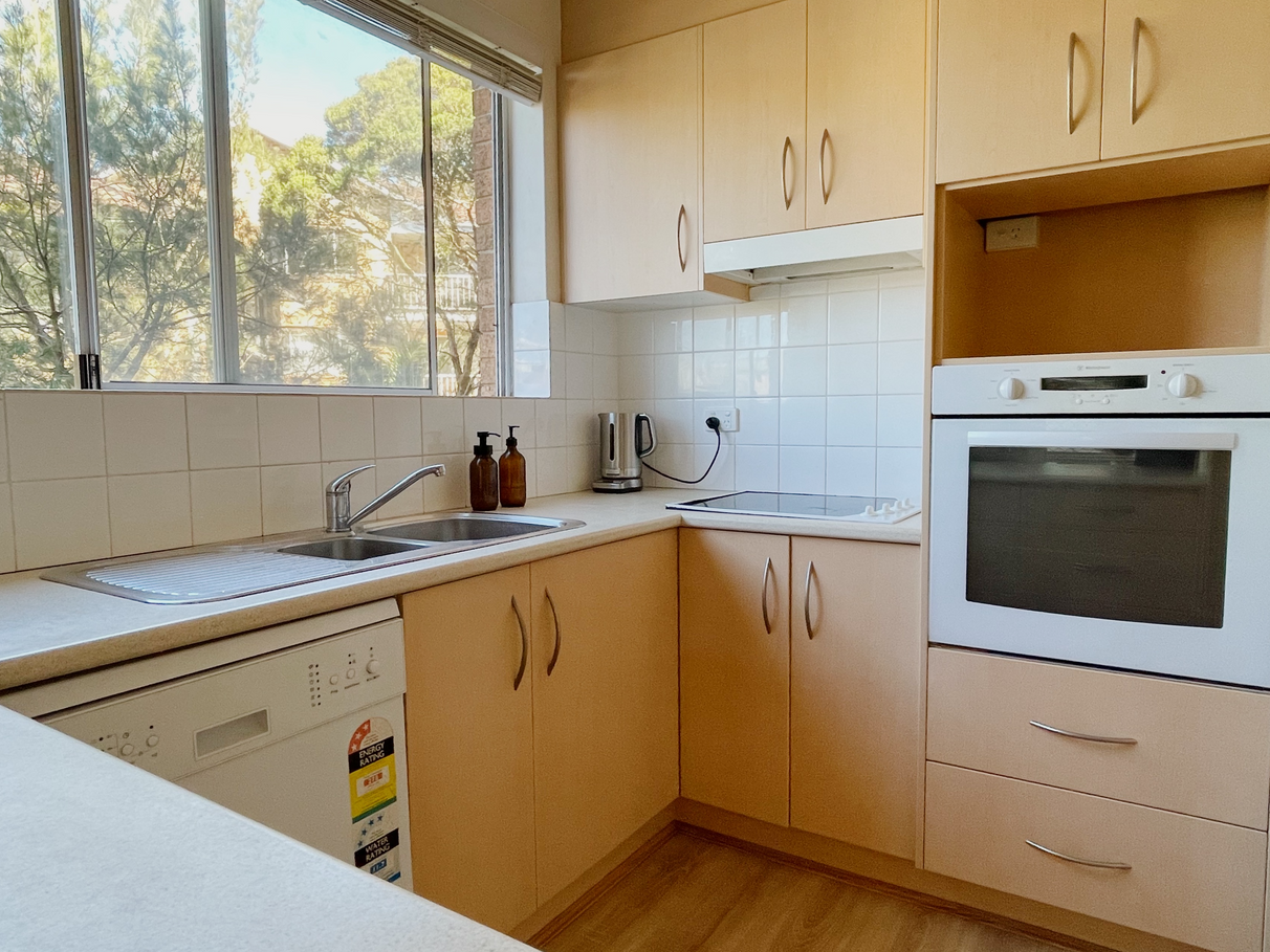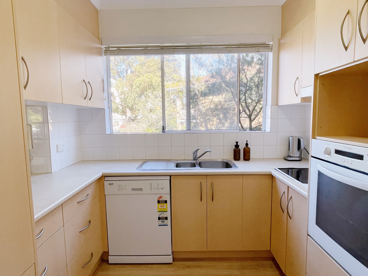 - Practical kitchen displays neutral tones and hosts ample bench and cupboard space with dishwasher.