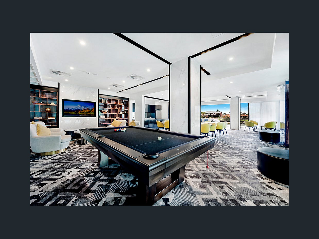 - Residents’ lounge with a library, pool table, TV, and waterfront patio.