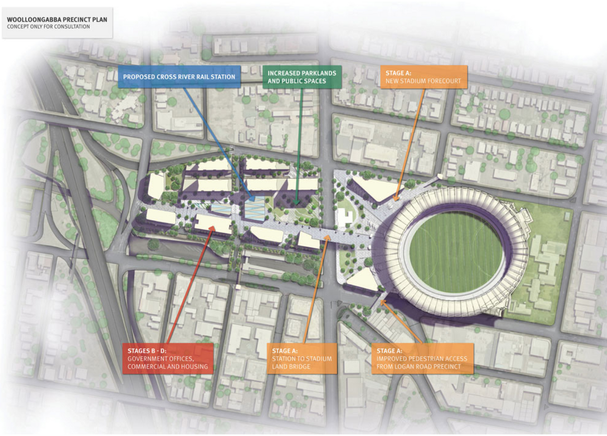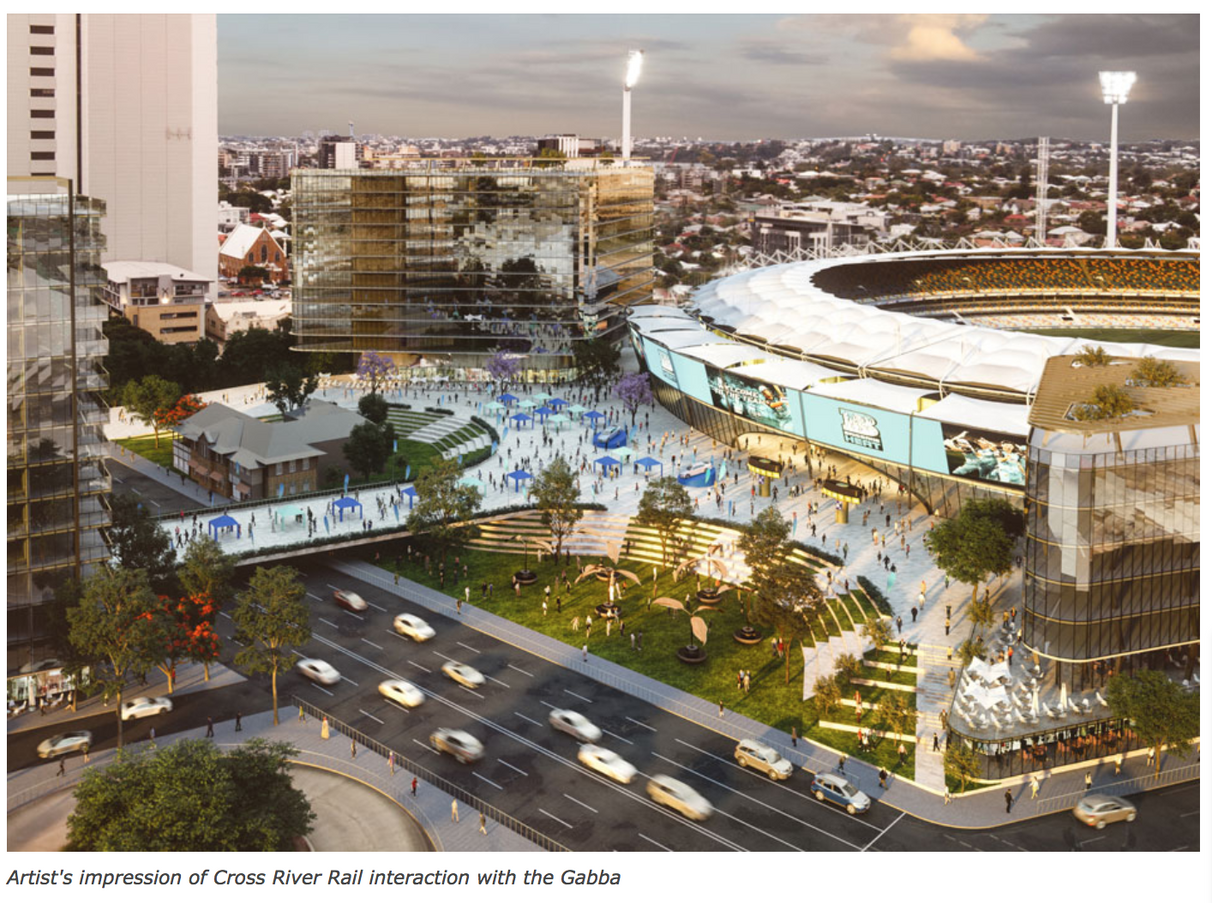 5.4 Billion dollar Cross River Rail project with a new Woolloongabba station that will improve access to the Gabba, make an already thriving entertainment district feel more a part of the expanded city centre. The underground rail system is expected to be finished in 2024, generating 7700 jobs during construction.