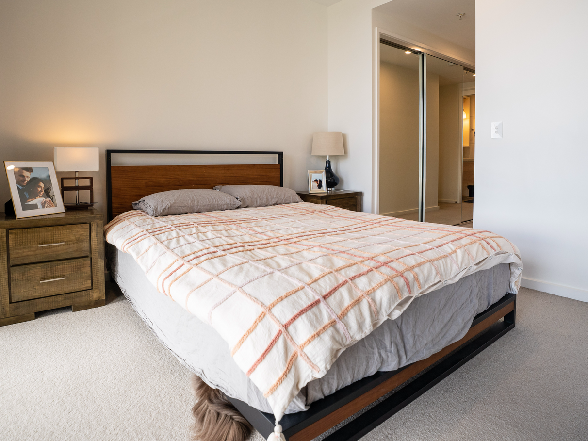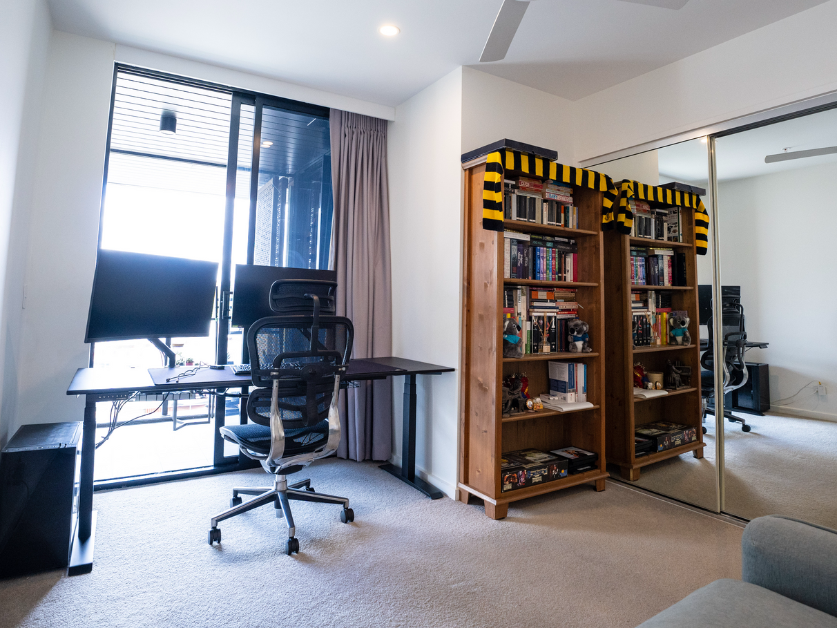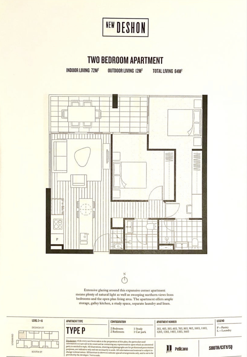 This beautiful north-facing corner apartment is located on level three of the New Deshon Apartments in South City Square. Full of natural light, the stone bench kitchen, dining, and living zone immediately invite you in. Both bedrooms are equally spacious with the main bedroom being an ensuite and offering a cozy study nook.