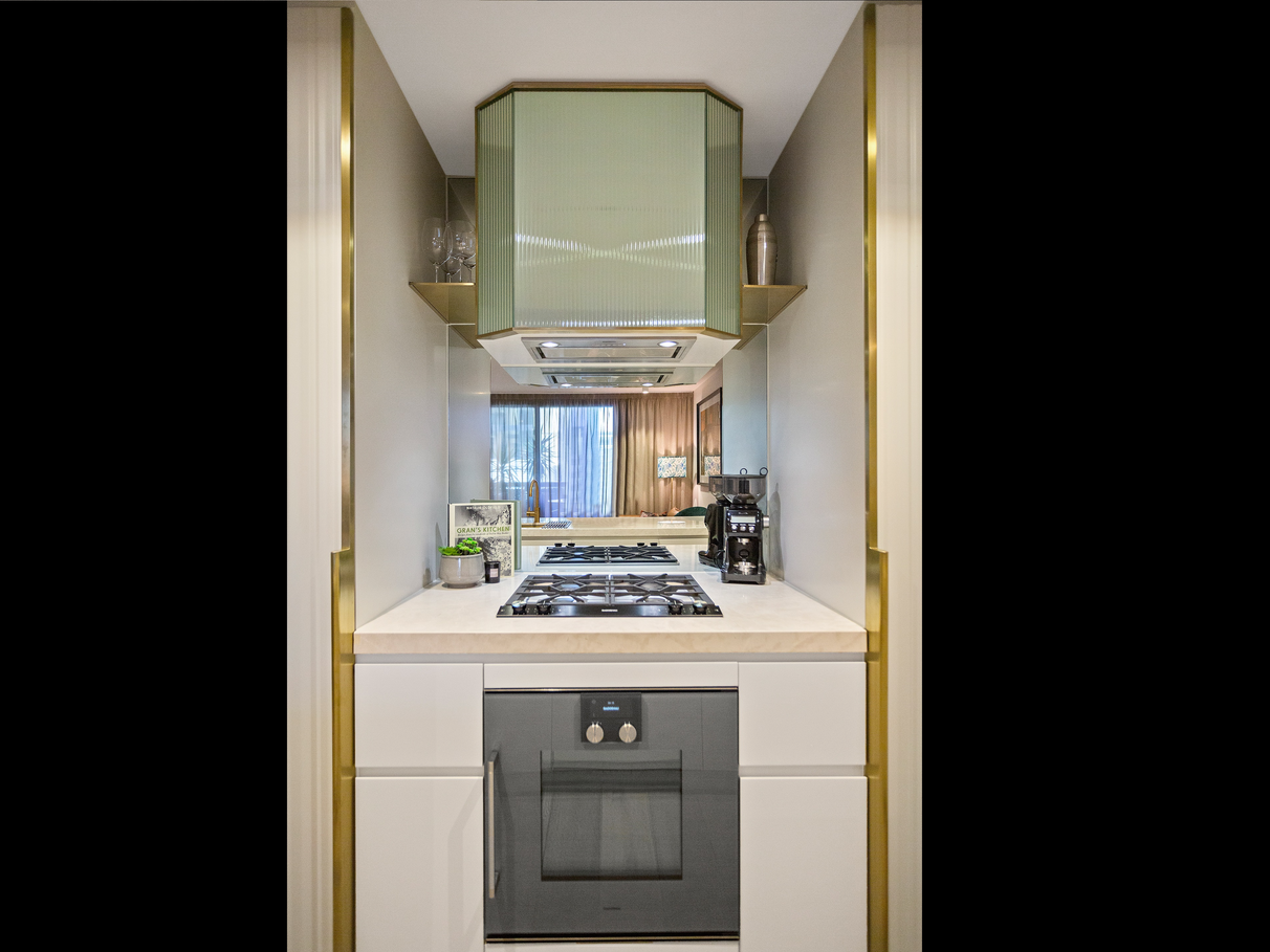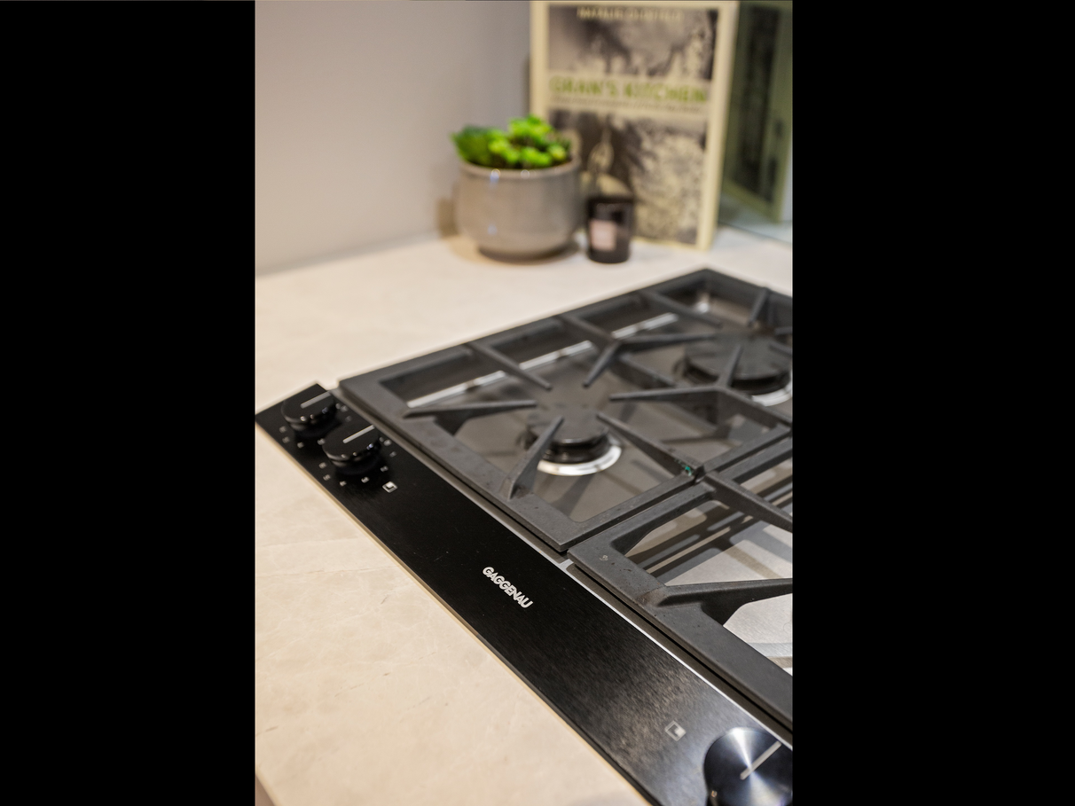 • A sleek and modern kitchen showcasing an island stone bench, pull-out pantry cupboard, a concealed fridge space, full sized dishwasher and the full complement of integrated Gaggenau appliances including, gas cooktop and oven.