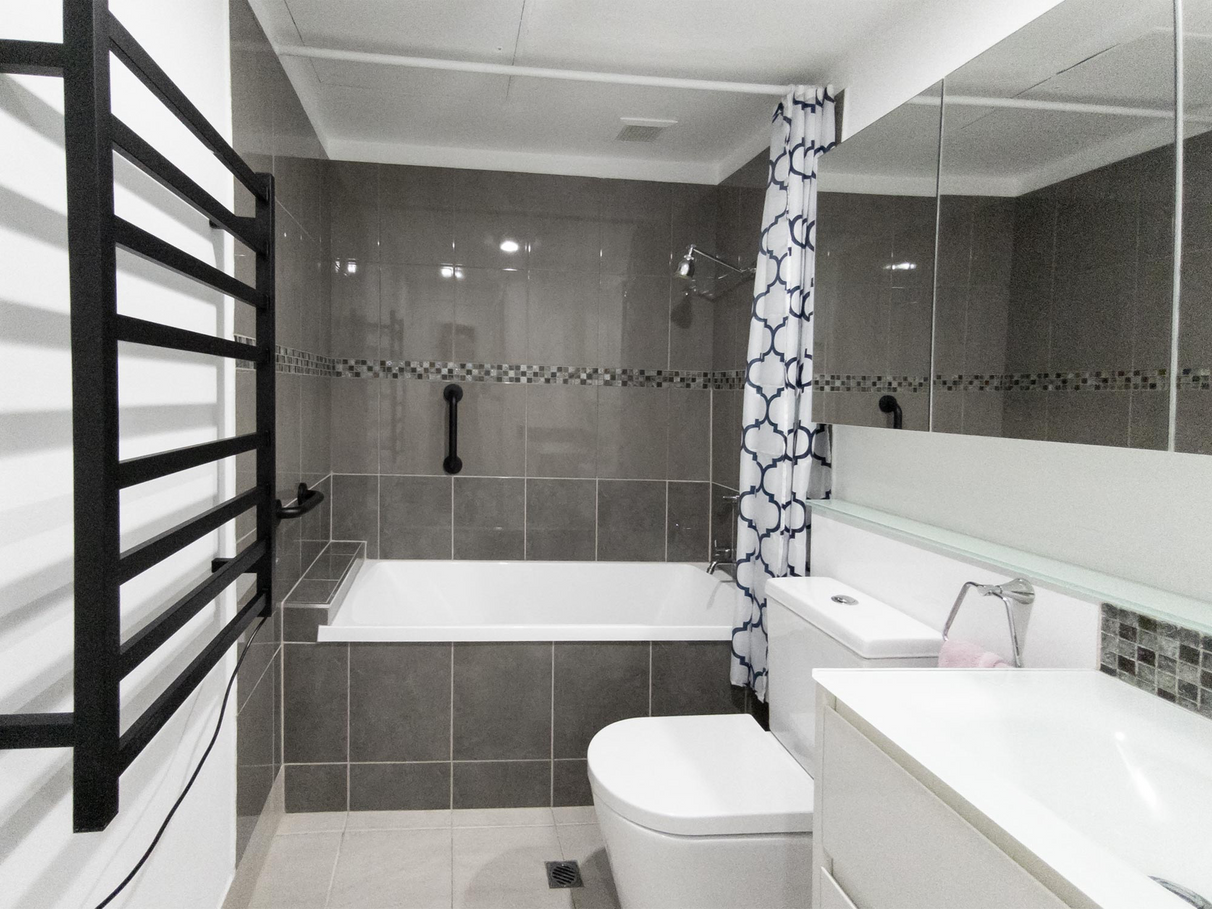 The tiled bathroom provides ample storage, bath/shower and euro laundry.