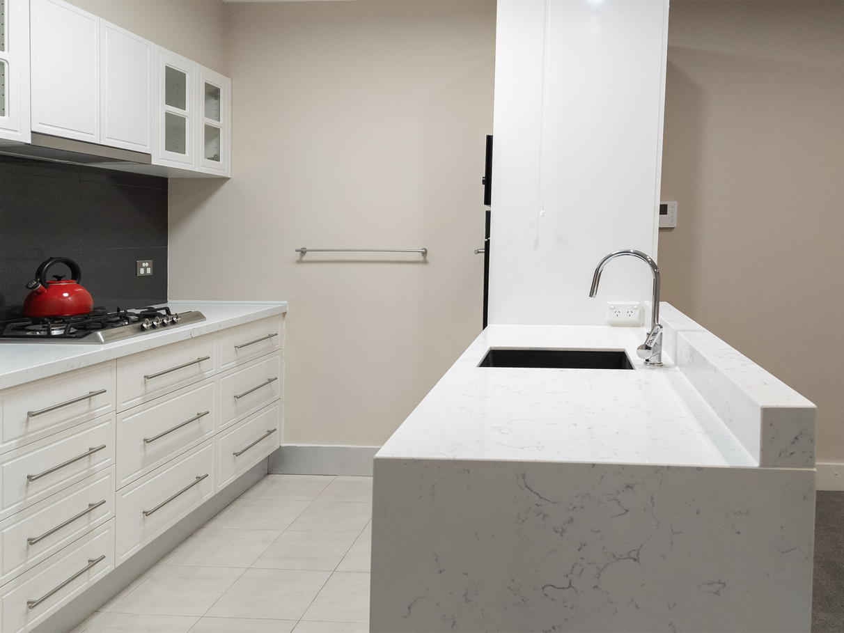 The updated kitchen has stone bench tops, Smeg gas cooktop, seperate wall oven and pantry.