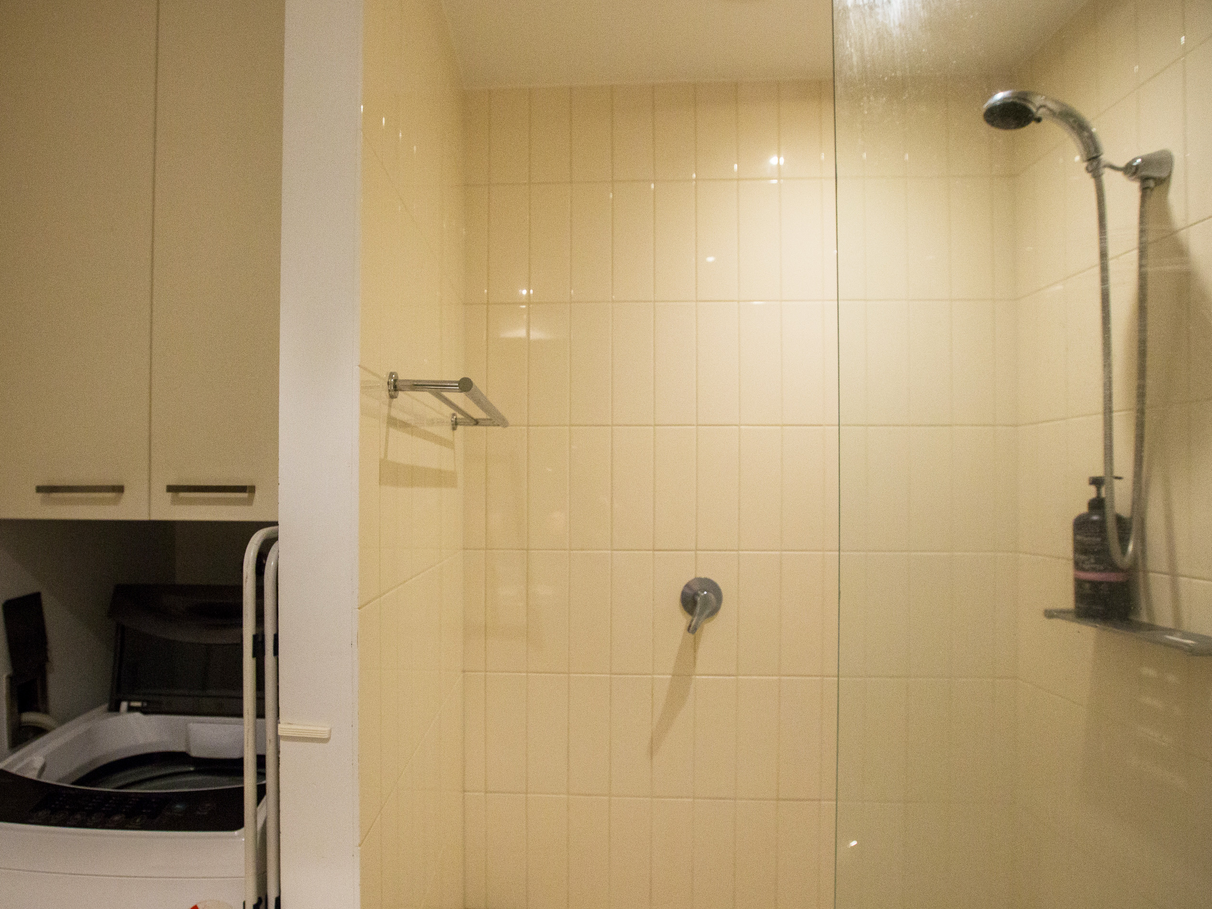 The bathroom features a walk-in shower, single basin surrounded by a large Ceasar Stone bench top and laundry facilities with overhead cupboard space. The 7kg top load washing machine is included in the sale of the property.