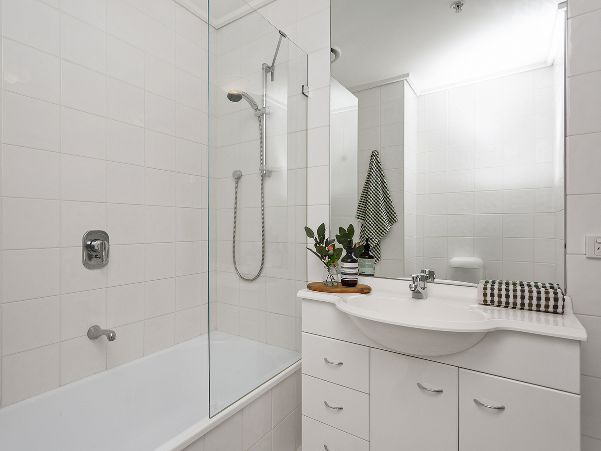 - Spacious bi-fold laundry (no tiny euro laundry) with dryer included, amidst the large central bathroom with shower over bath
