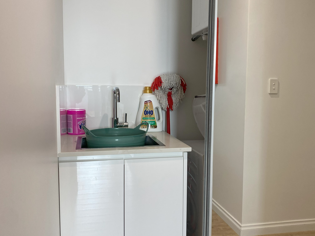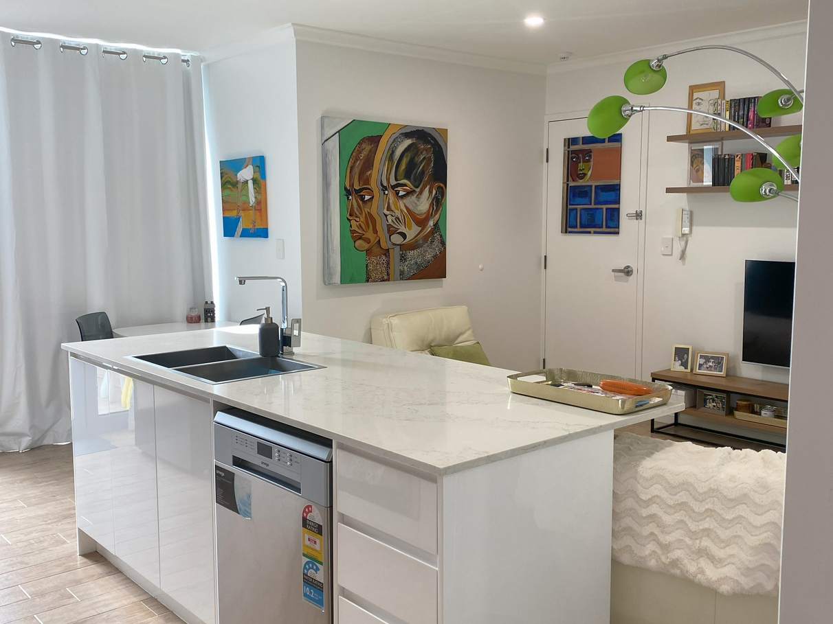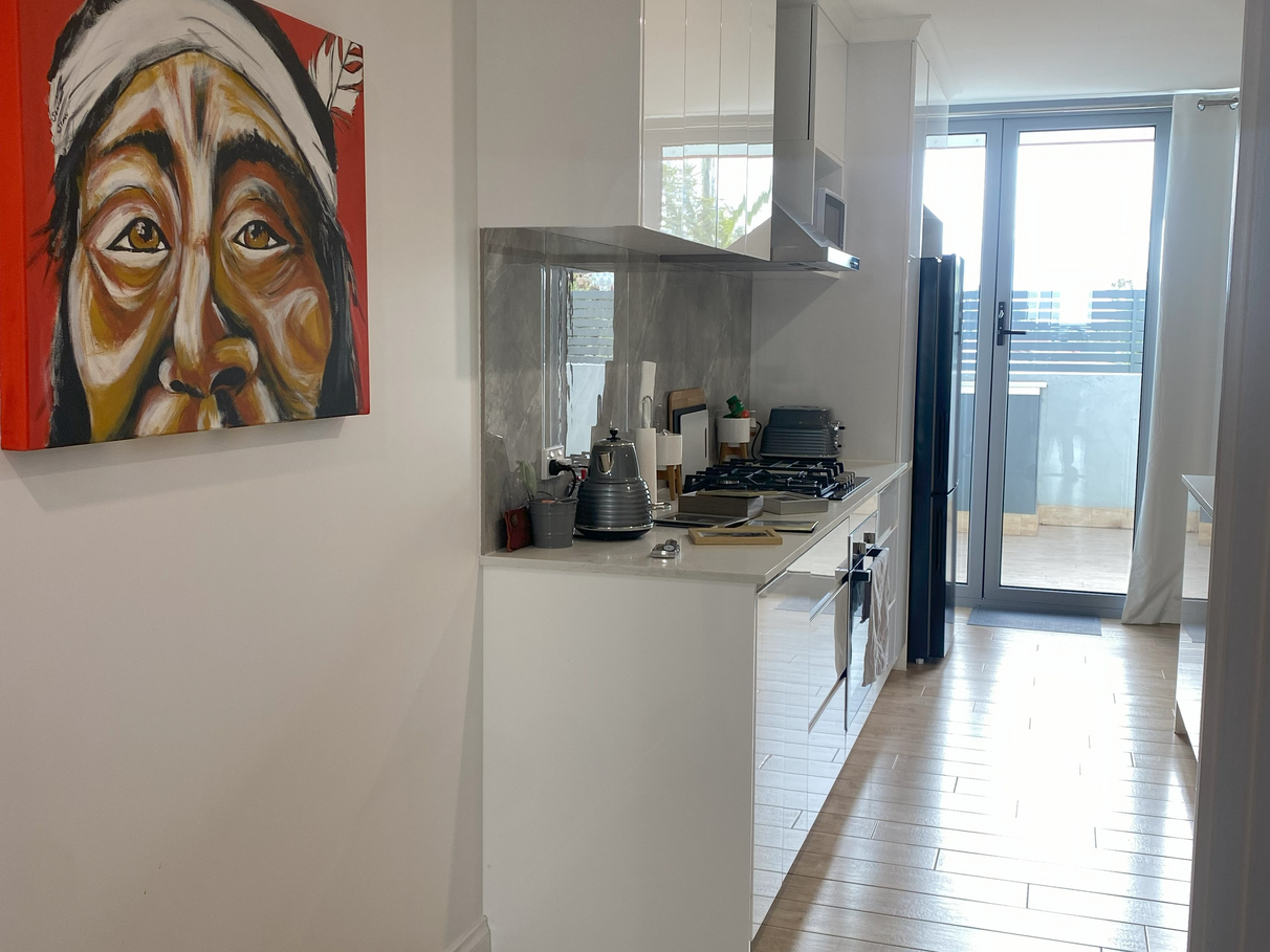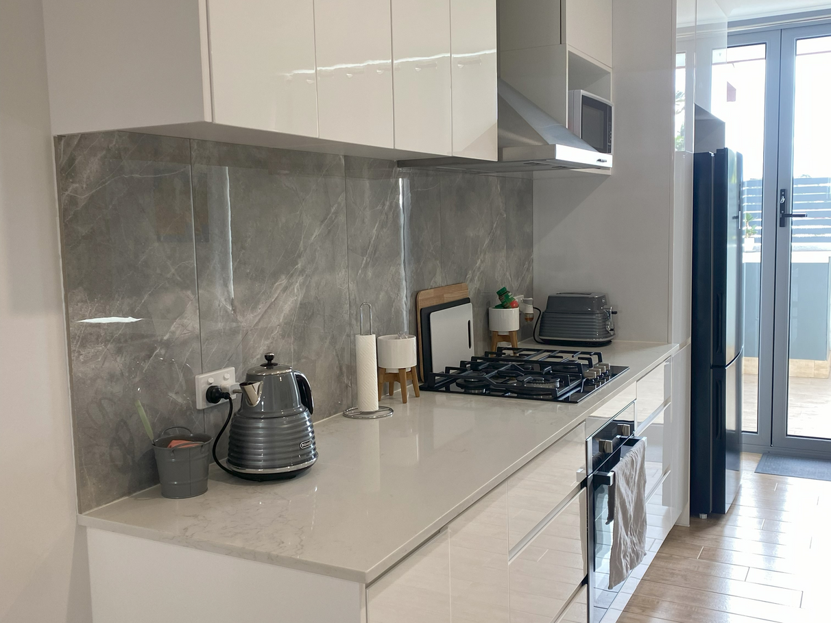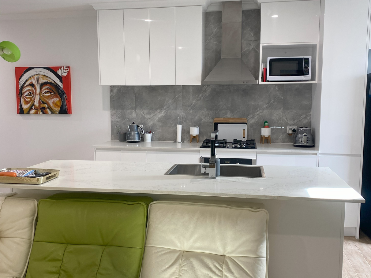 Kitchen with stone bench top, soft closing doors and drawers, tiled splash back, rangehood, oven and hotplates.