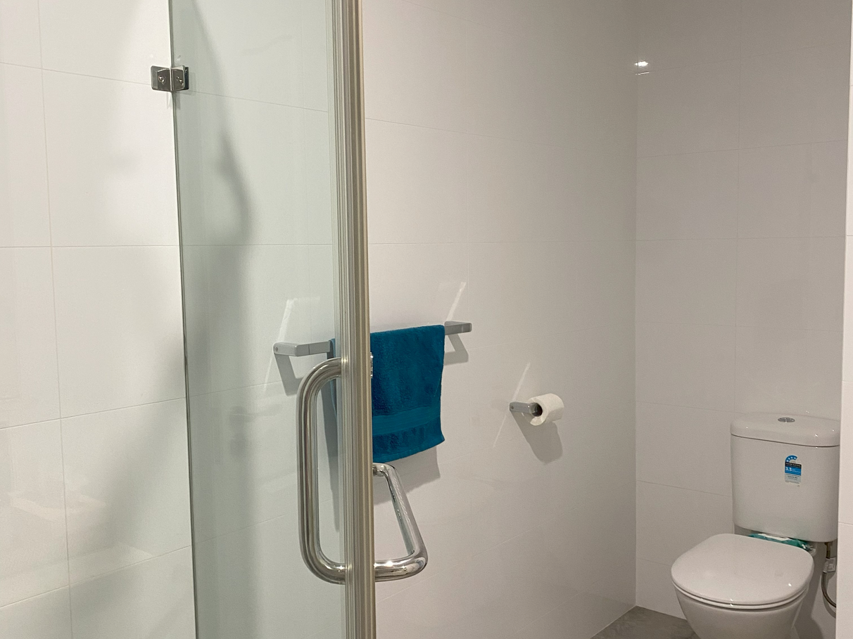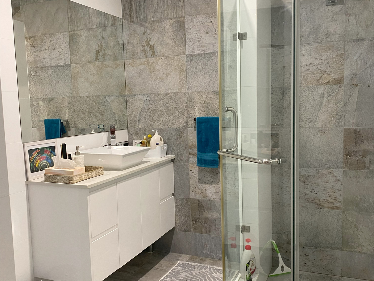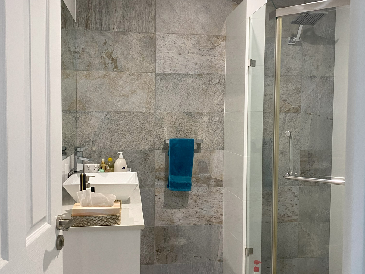 Functional floor to ceiling tiled bathroom with an ample shower and modern vanity.