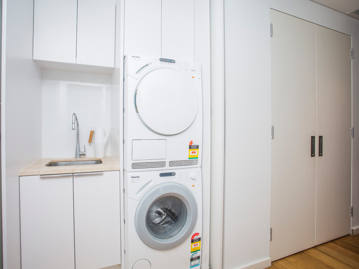 * European laundry with Miele washing machine and dryer, with built-in cupboards