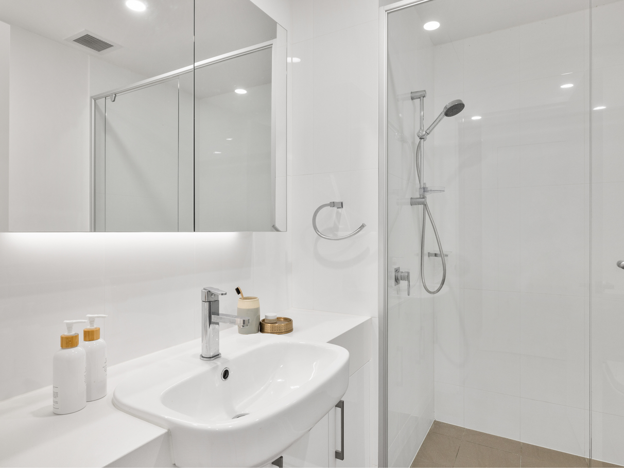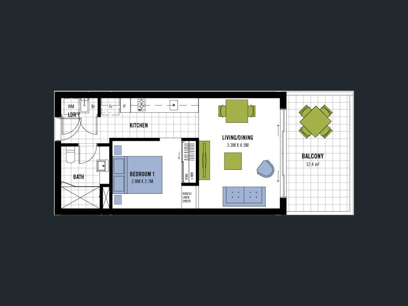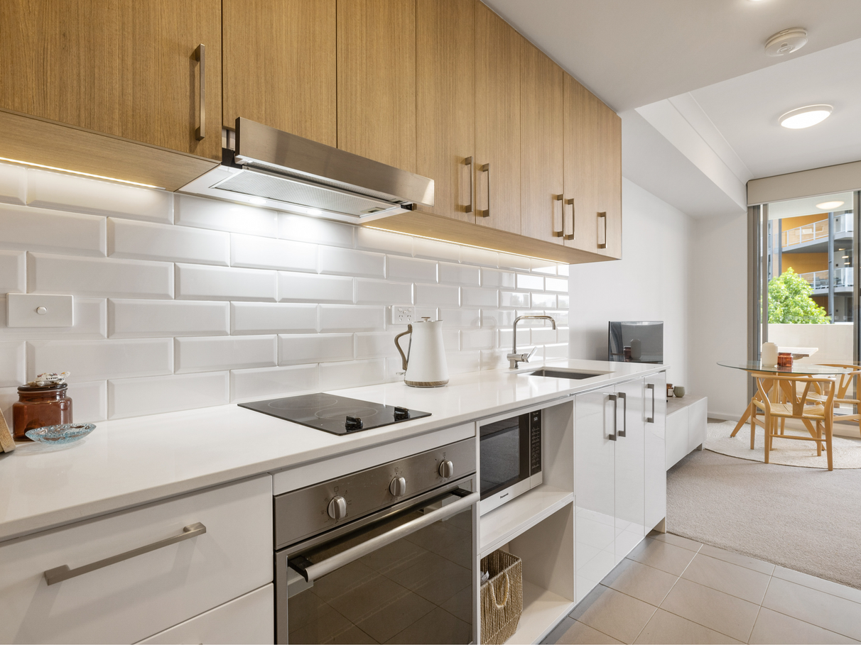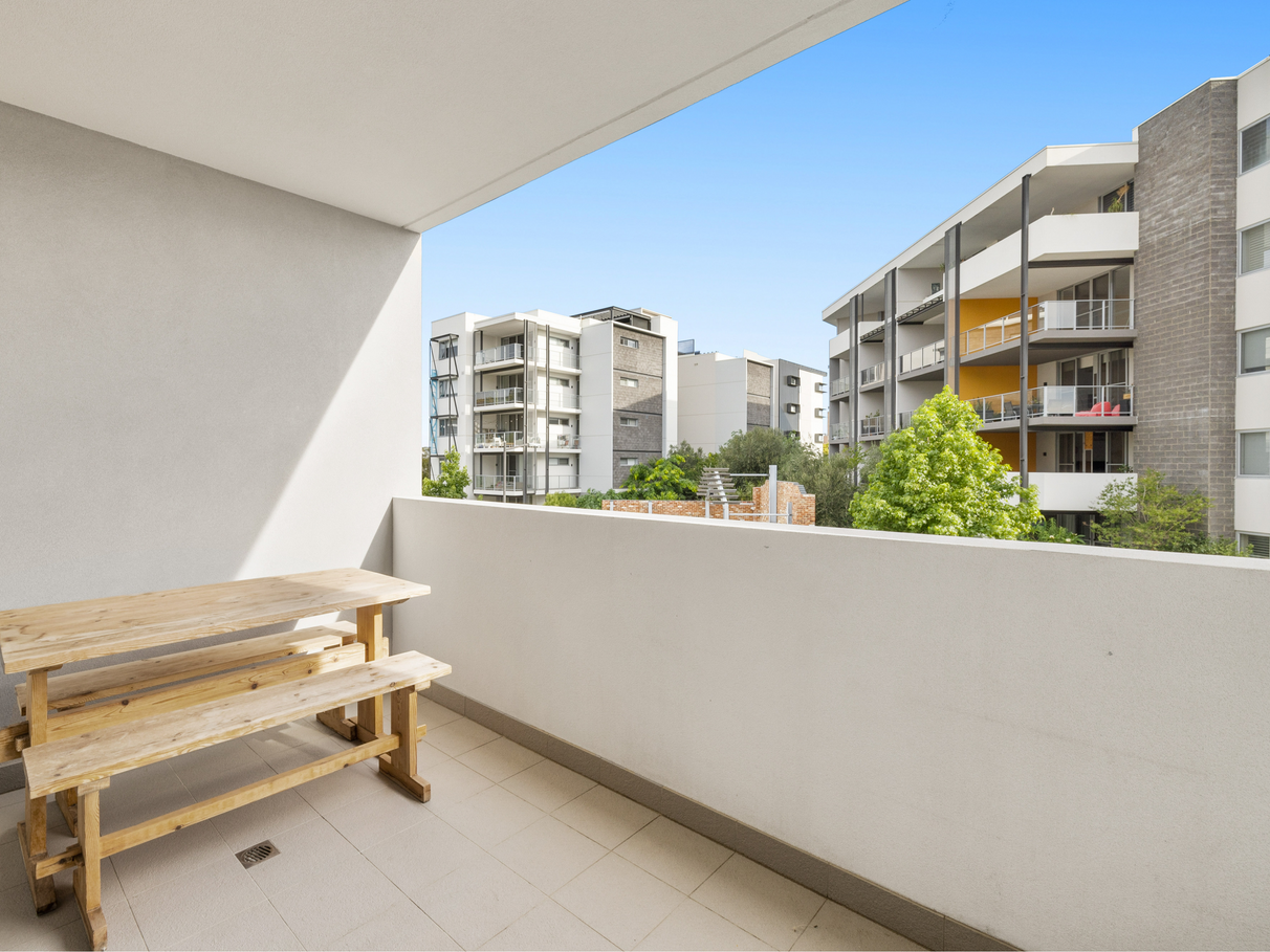 This one bedroom, one bathroom apartment maximises on space and takes advantage of a huge balcony. Sliding doors double the living and dining space by spilling out onto the balcony seamlessly integrating the outdoors in and maximising your entertaining area.