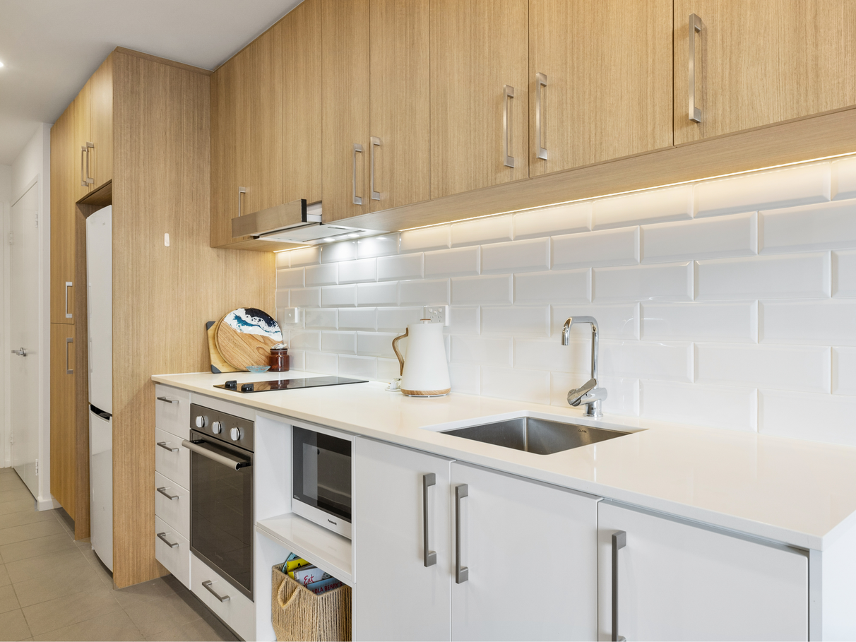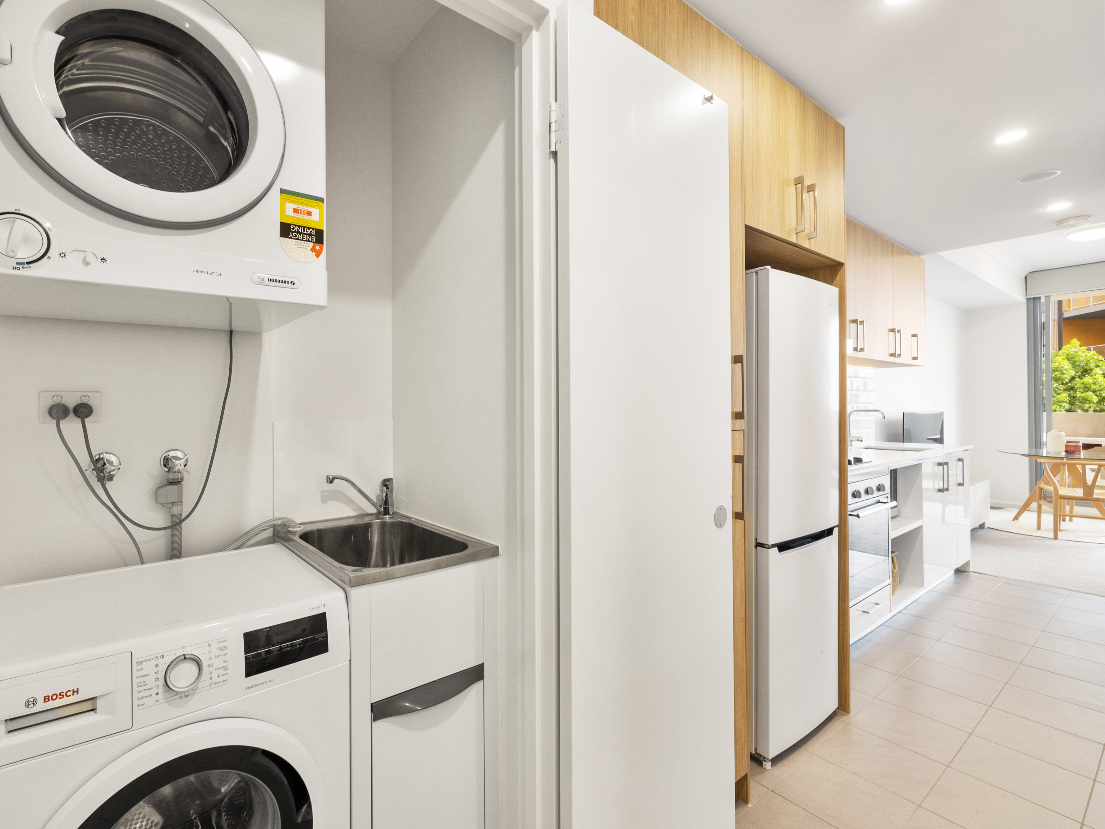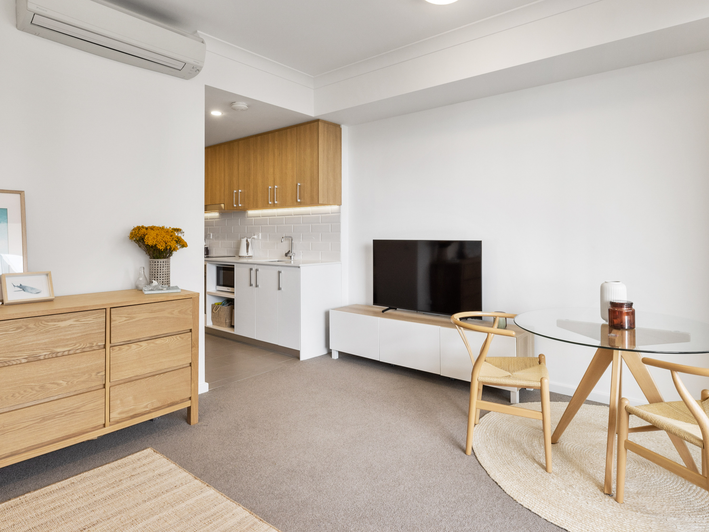 This one bedroom, one bathroom apartment maximises on space and takes advantage of a huge balcony. Sliding doors double the living and dining space by spilling out onto the balcony seamlessly integrating the outdoors in and maximising your entertaining area.