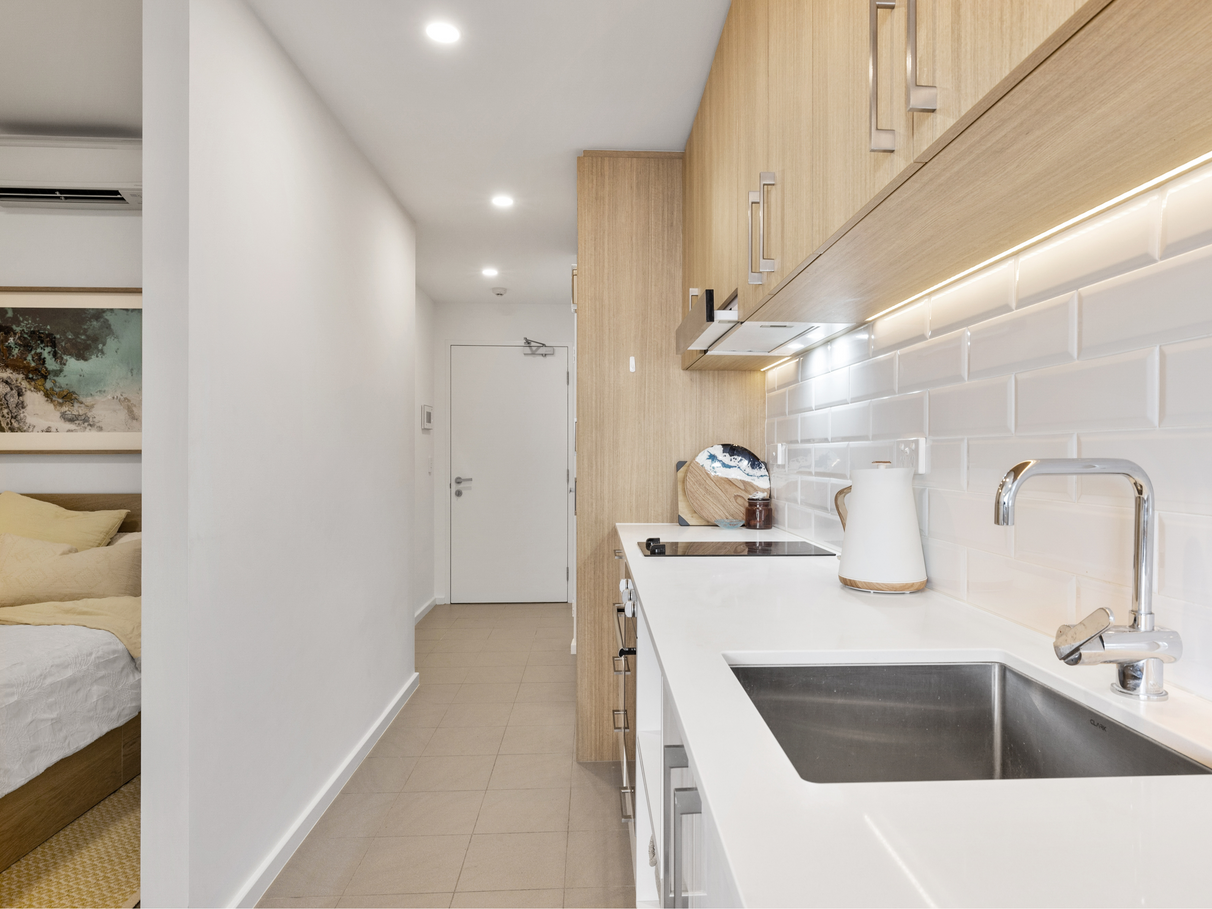 The large bedroom has built in dressing nook as well as robe storage. With a hidden laundry neatly tucked away and a galley kitchen your new home is sure to impress.