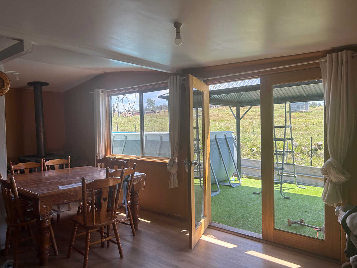 The main homestead sits proudly overlooking the property. Inside, you’ll find a light-filled interior with timber floors, a wood heater, and air conditioning. The kitchen and living areas invite warmth and family connection, opening to scenic rural views that stretch across the paddocks.