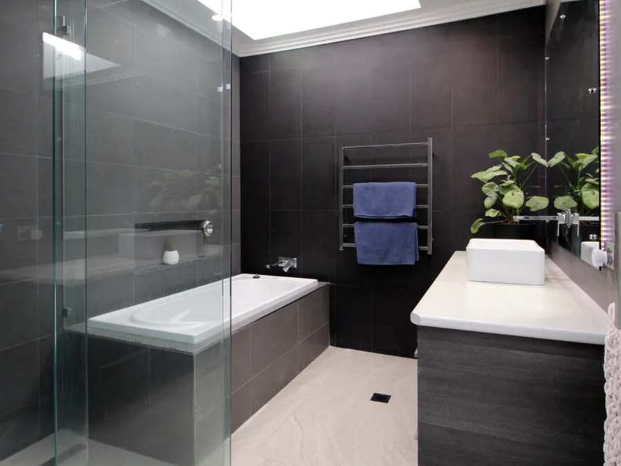Luxurious main bathroom showcasing C-Bus lighting, back-lit mirror, large skylight, bath, and shower