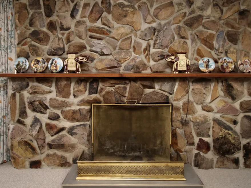 Formal lounge room with a stunning stone open fireplace
