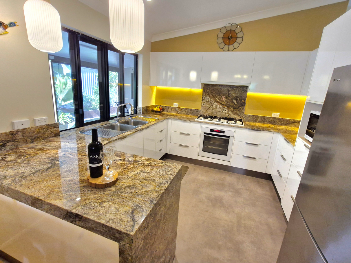 *Practical Kitchen design with full bench-height windows and garden view, deep double bowl sink with double draining board, soft-close white gloss cabinetry, Brazilian granite countertops with waterfall edge, 5-burner gas cooktop, pyrolytic oven, a servery to patio with granite shelf, and plenty of storage and bench space.