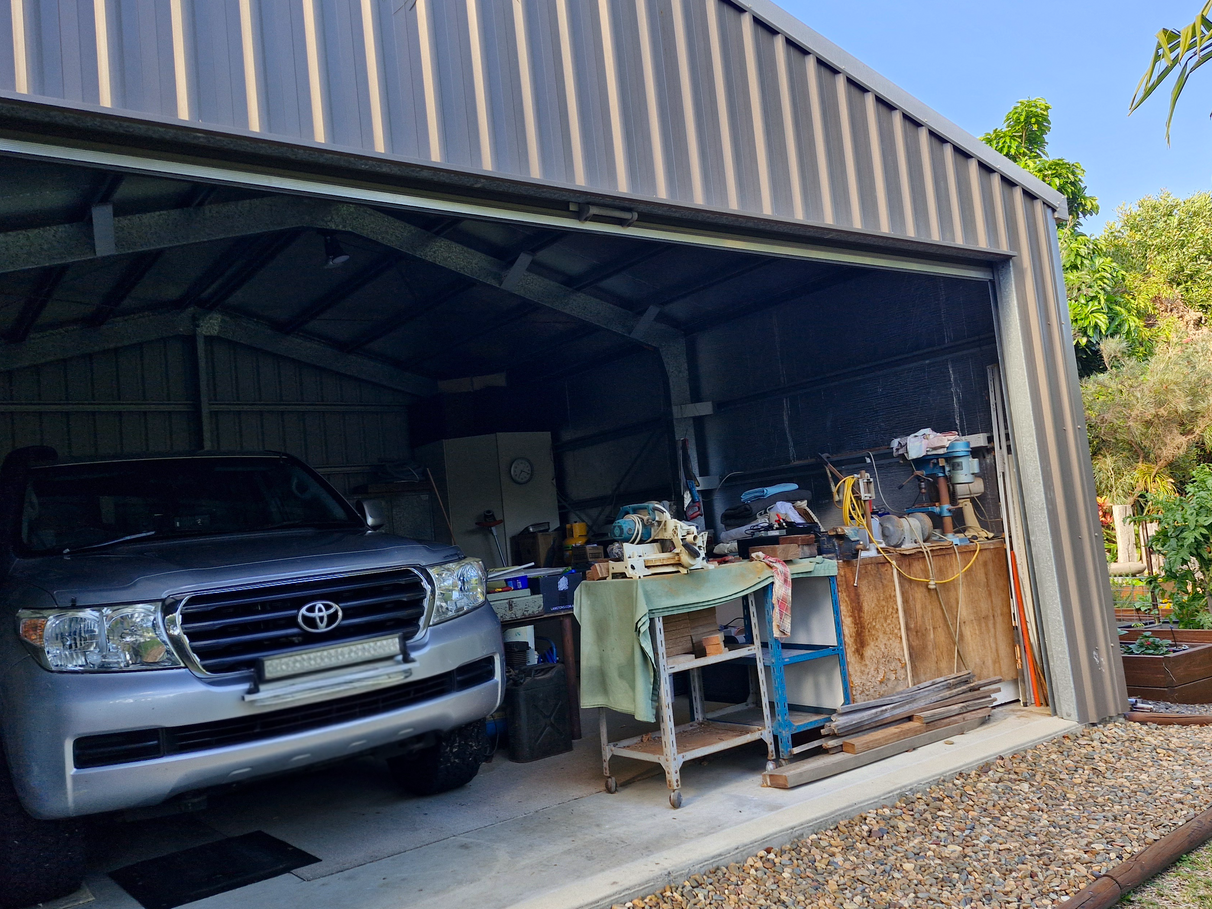 * 6m x 6m Patio World free-standing Colourbond shed (2.4m height), power and water connected, with room for a 4 wheel drive vehicle on one side and a workshop on the other fully fitted out with storage cabinetry, with side-gated access.