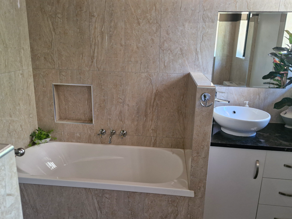 *Luxury main bathroom and ensuite, finished with travertine tiles, marble counter-tops, bevelled glass mirrors, rainwater shower roses and quality fittings.