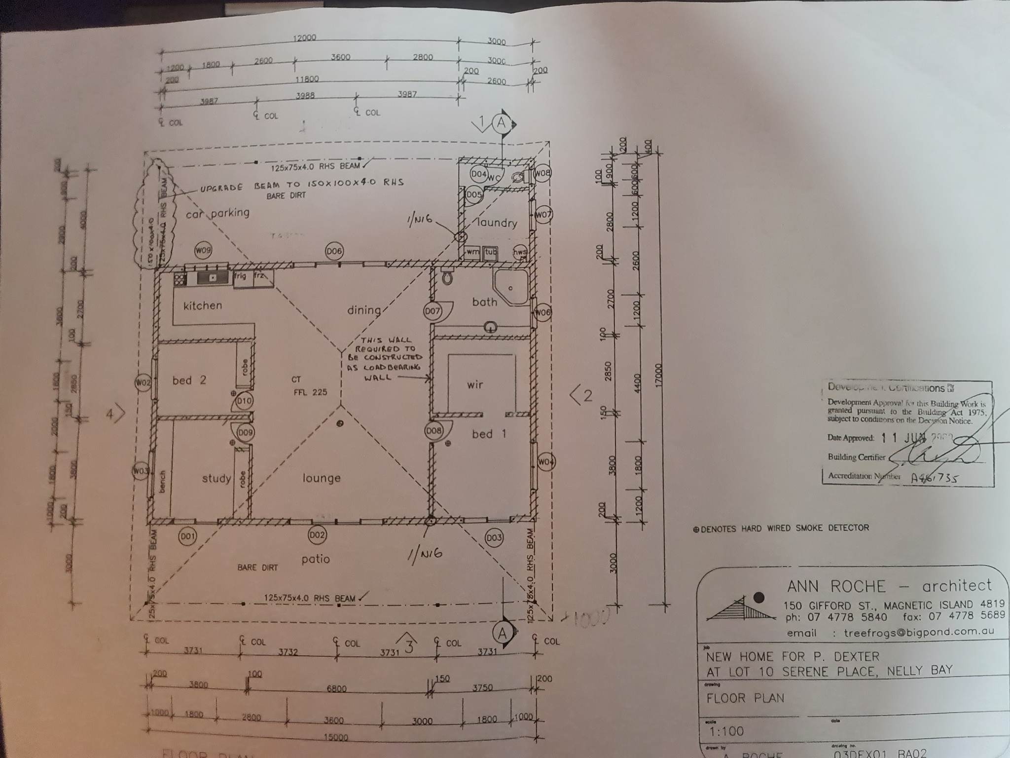 Concrete filled block internal (gyprock lined) and external walls (rendered). Windows & Large Sliding doors all tinted. Fully tiled with off white 300mm square tiles.