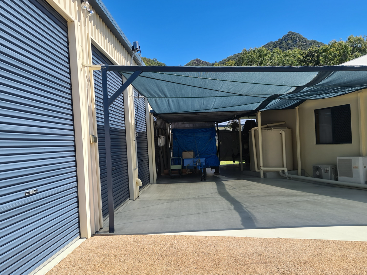 Shed is 6mts deep x 17.5mt long with 5 roller doors. Has a loft with a room with airconditioner used for sewing n craft.