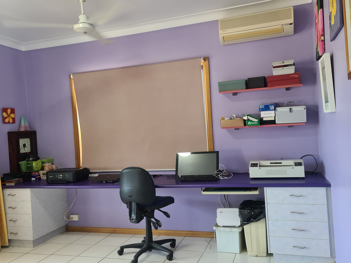 With a walk-in wardrobe 3 x 4 mts with blind covering window, large sliding glass door opens onto the front deck. Airconditioner & ceiling fan.