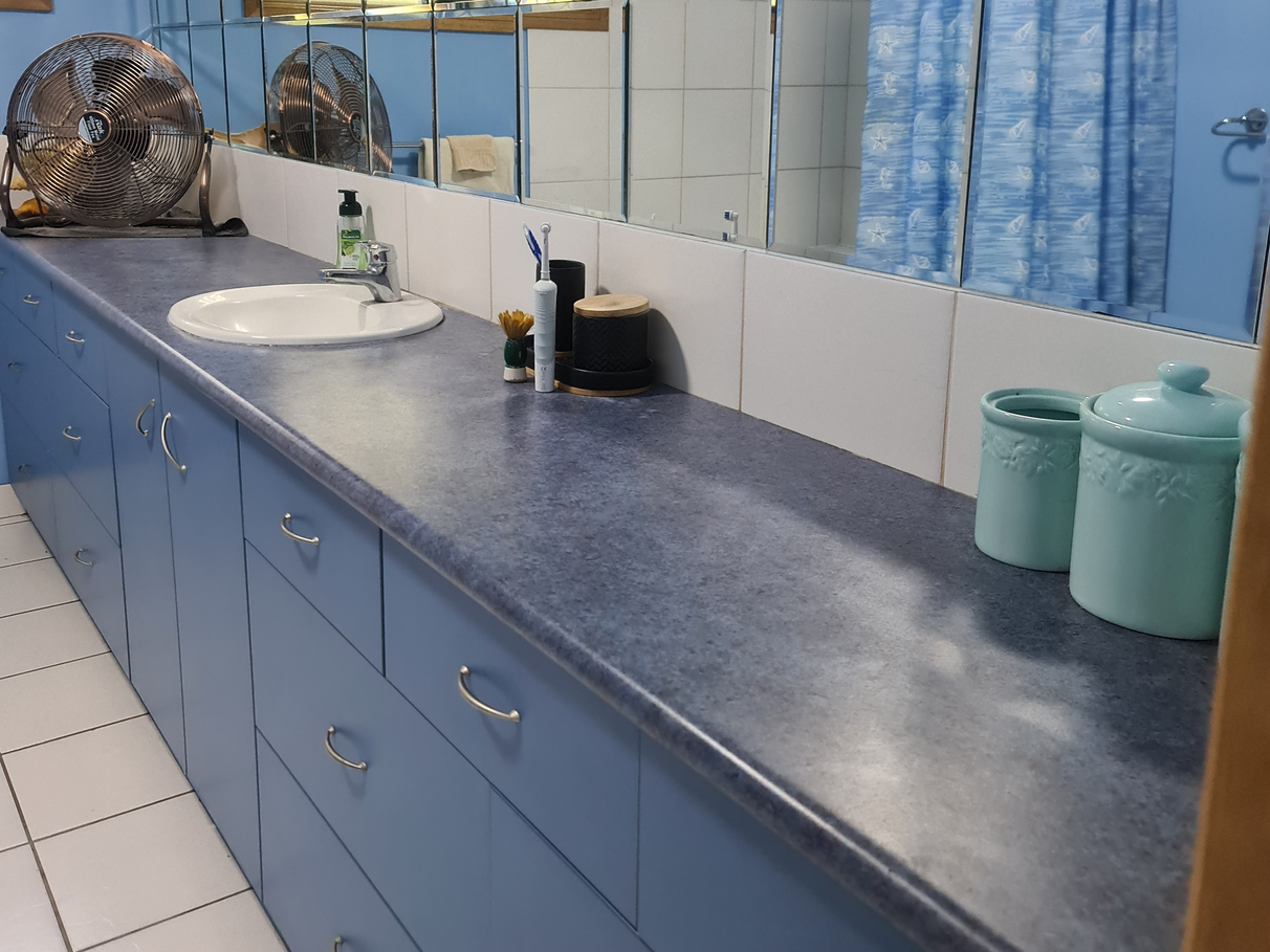 Bathroom, 3 x 4mts, Vanity 4mts long with draws under acting as linen storage with mirror tiles. Toilet & shower/bath with pull around shower screen.