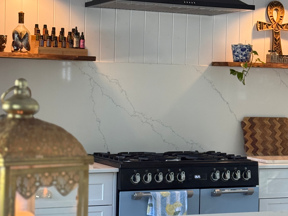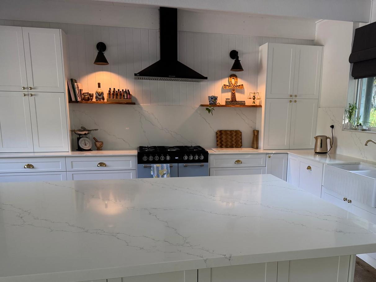 Gourmet kitchen with a 1.5–2.5 m stone island bench, farmhouse cooker, and gas-strut window opening to the outdoors — perfect for watching the kids play in the sparkling 17 m × 2.5 m pool
