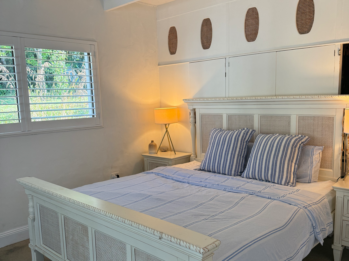 Master suite with built-in wardrobes, a safe, and an ensuite featuring a freestanding bath overlooking flame trees and kookaburras