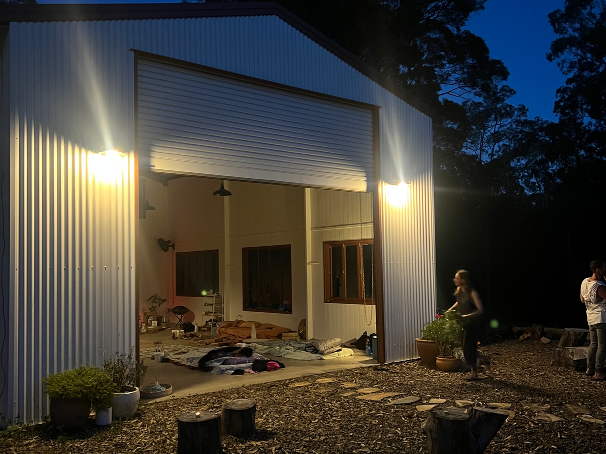 An 11 m × 10.5 m lined, polished-concrete barn with 4 m doors and awning windows — currently used for retreats, yoga, celebrations