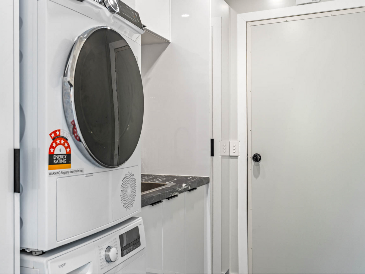 ✅Seperate laundry with great storage cabinets.