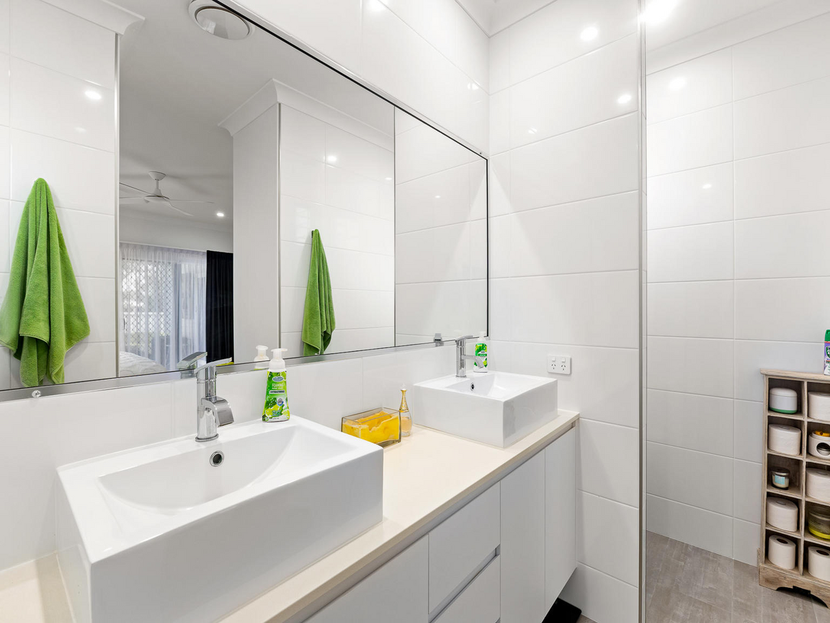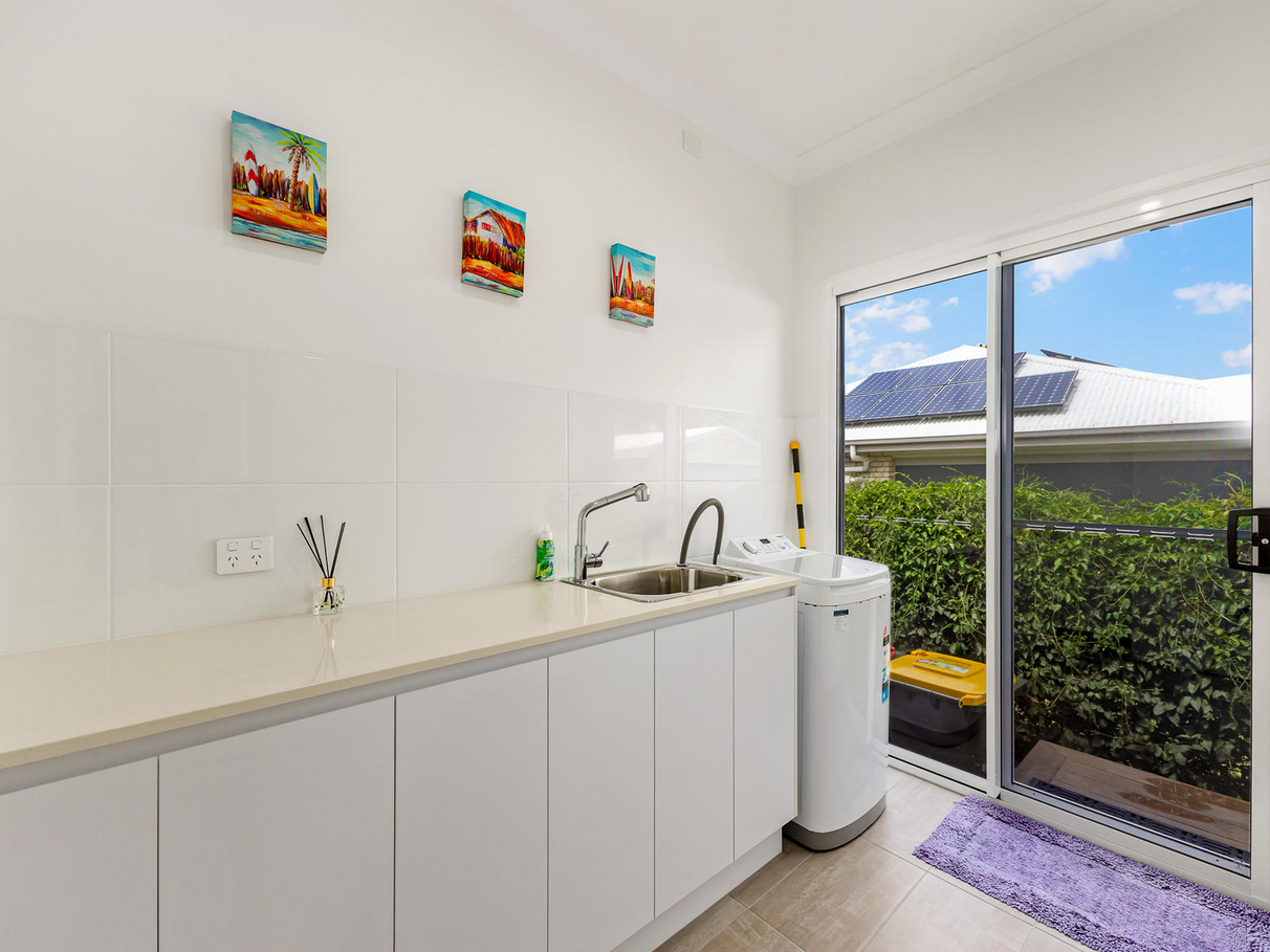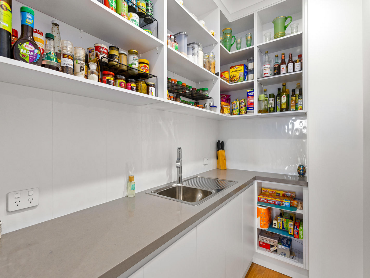 The modern kitchen is a chefs delight with wide ceasar stone benchtops, double bowl sink, dishwasher, plus modern oven and induction cooker. An abundant of storage for those over supply of appliances as there is a walk-in butlers pantry which has loads more cupboards and shelving and its own sink.