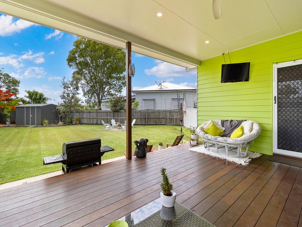 The kitchen adjoins the spacious family room with its own separate reverse cycle air-conditioning. The room offers ventilated windows to allow for the cool breezes during summer and leads out via stacker glass sliding doors to the huge Northeast facing rear timber deck. You can enjoy those summer breezes whilst having a pre dinner evening drink prior to family and friends enjoying a relaxed bar-be -que.