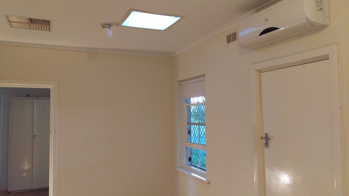 Comfortable air conditioned lounge with ceiling fan and fireplace.