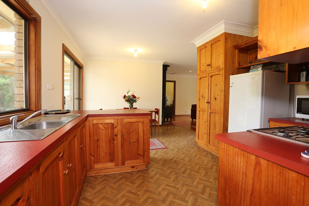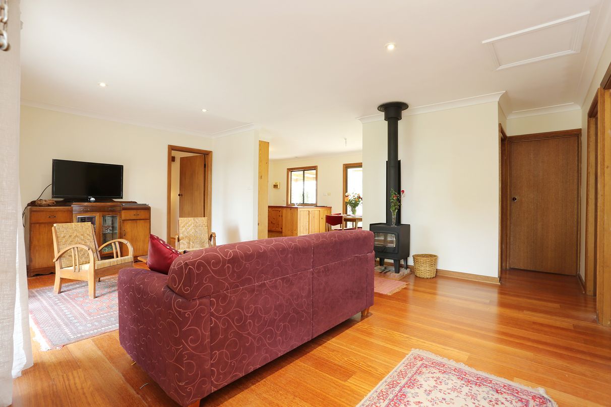 Large windows sharing garden views from the spacious open dining and kitchen, and a cosy adjoining lounge room with an ambient combustion wood heater. Opening outdoors to the undercover paved veranda overlooking lush gardens and plenty of lawn for the kids to roam and play.