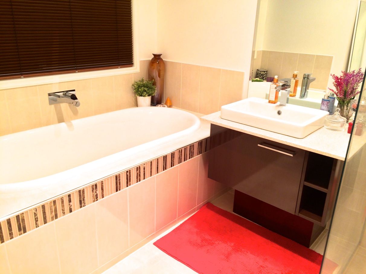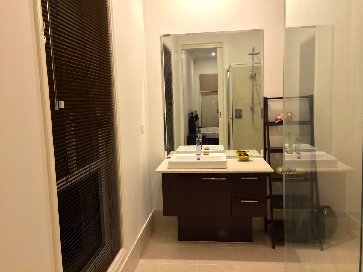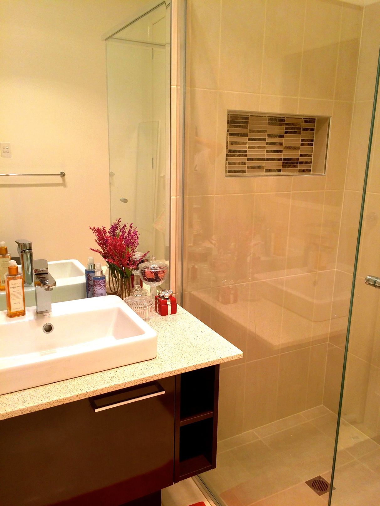 - All bathroom areas featuring modern basin with stone benchtop vanity units, semi-frameless shower screens and shower niches