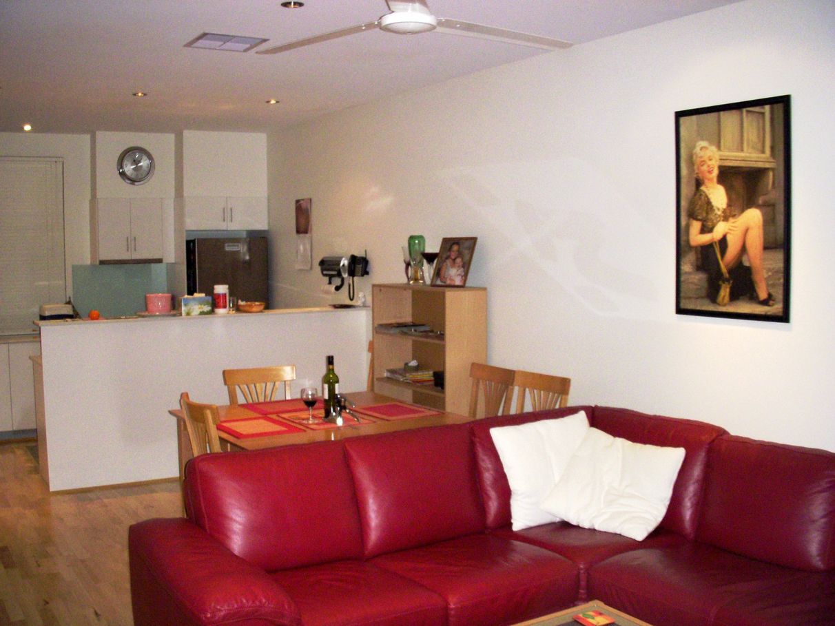 The upper floor include a modern kitchen with Smeg appliances, good size laundry and upstairs toilet. The large open dining/lounge area features extra high, curved ceiling and very wide french doors which open onto the upper level huge balcony.