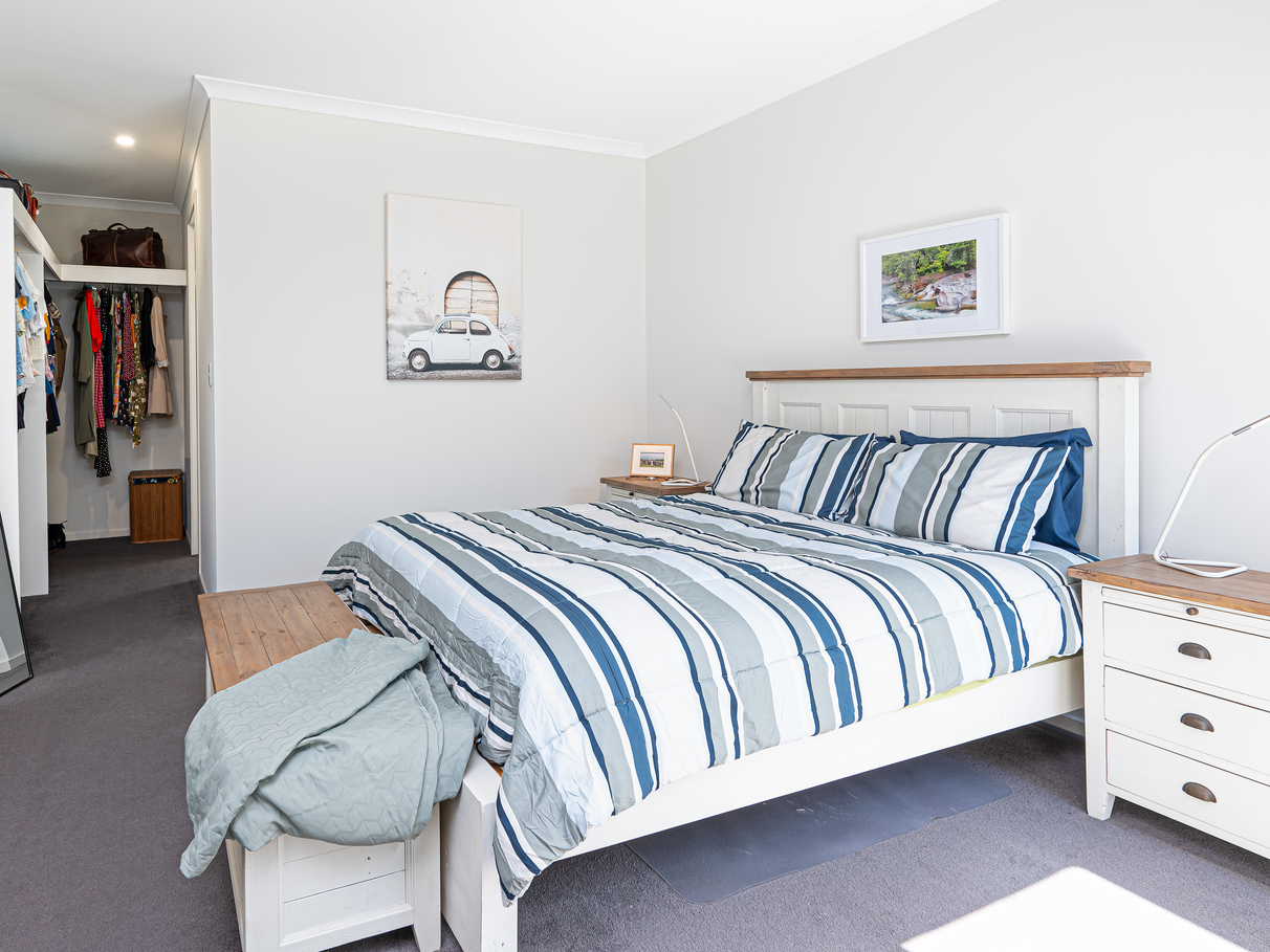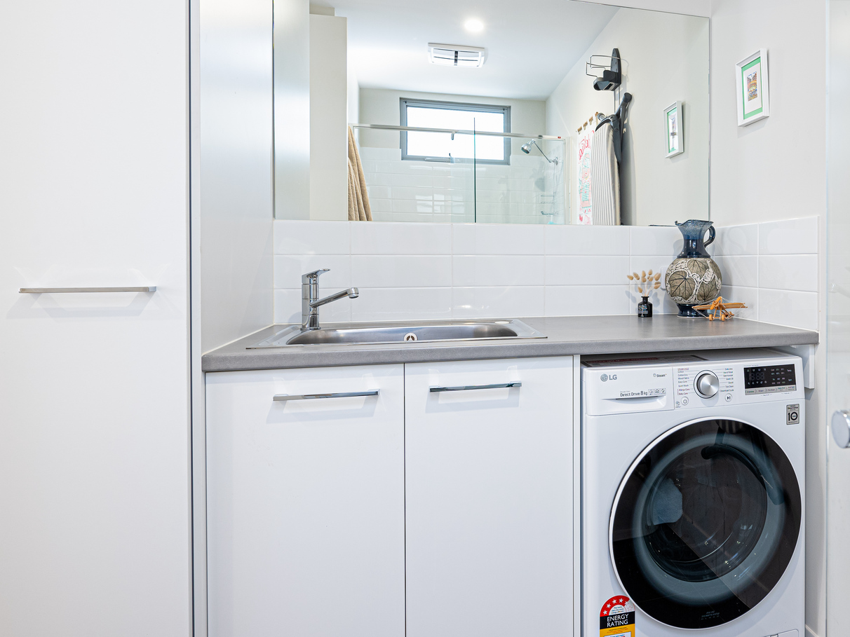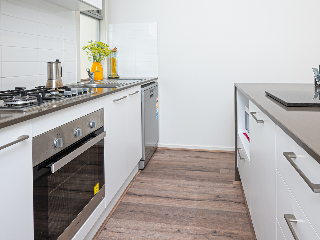 The functional kitchen contains ample storage, soft close drawers and stainless steel appliances (gas cook top, electric oven and dishwasher). A central bathroom with integrated laundry and linen press sits conveniently behind allowing you to effortlessly manage the practicalities of life.