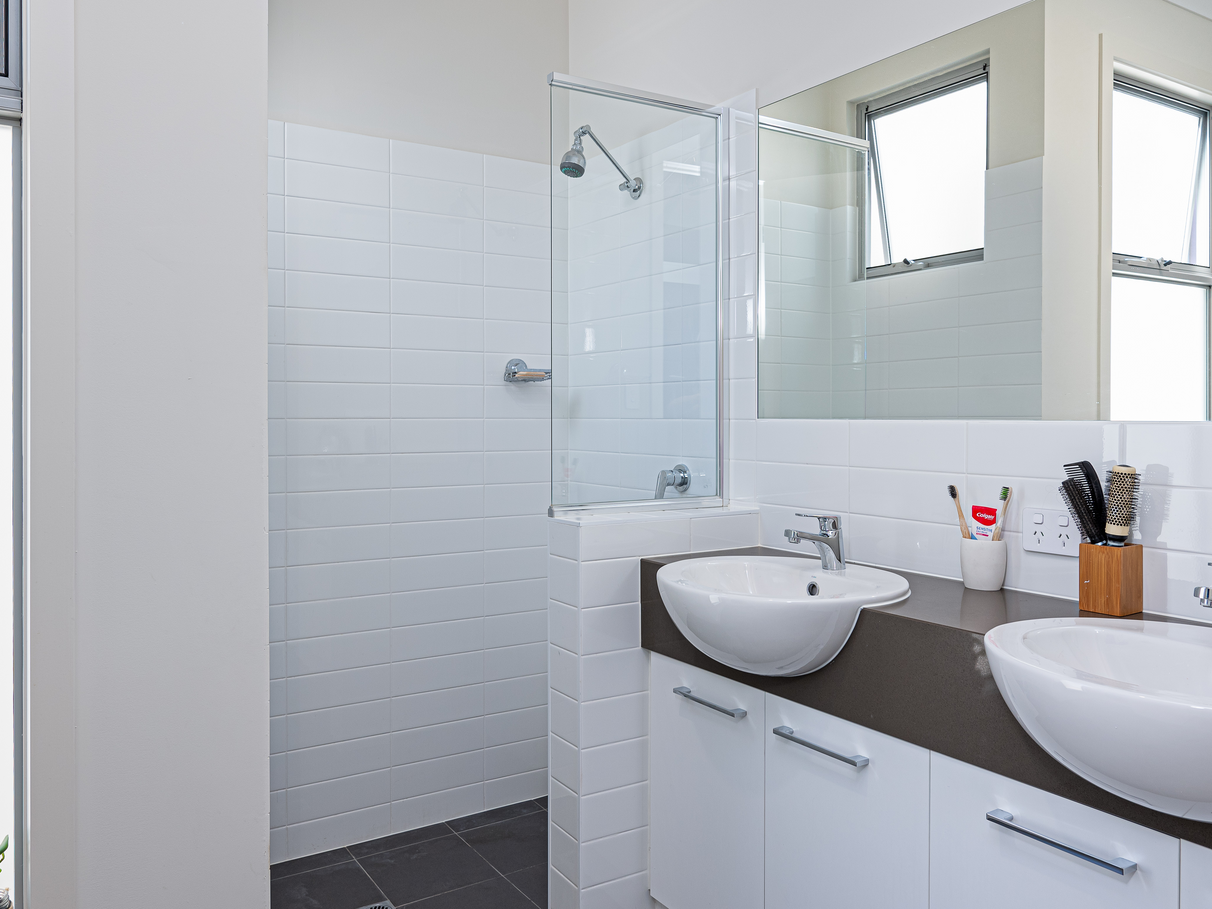 Three further bedrooms are located on the top floor creating a private space away from the main living and entertaining areas. The first and second bedrooms offer an adaptable space with tall built in wardrobes, full length mirrors and enough room for a double bed and desk. The master bedroom sits quietly at the back of the property and has large windows, a walk-in robe and ensuite with double sinks.