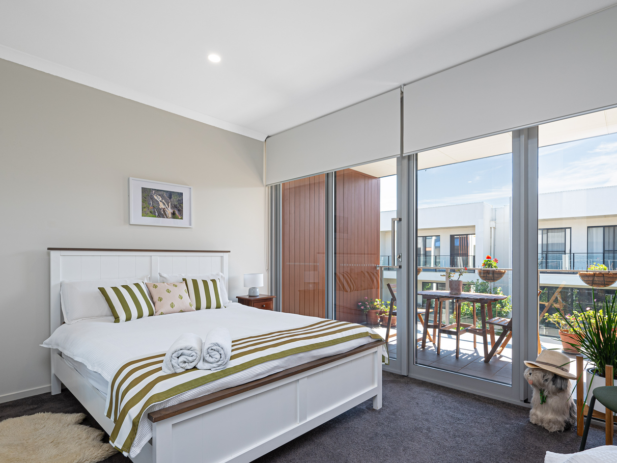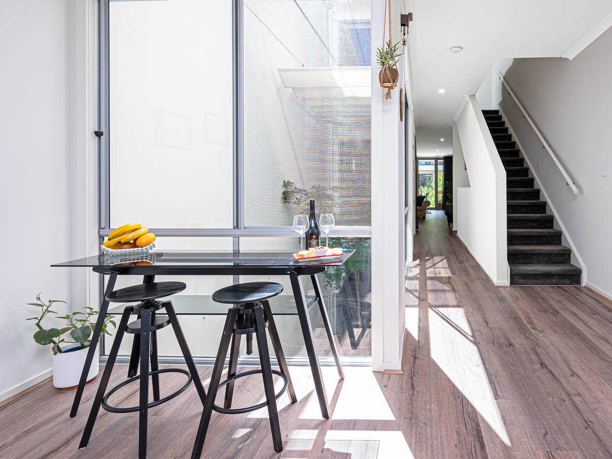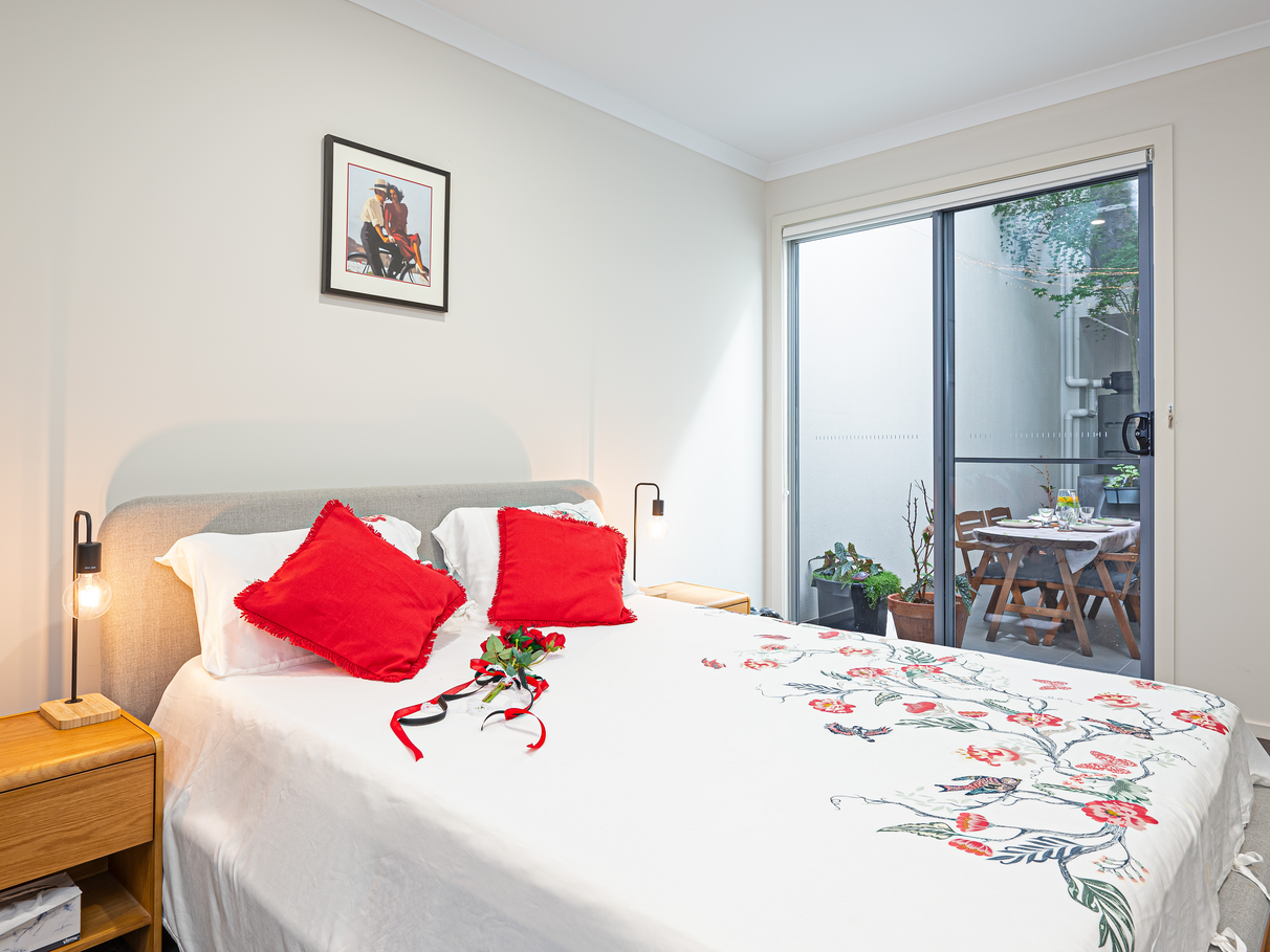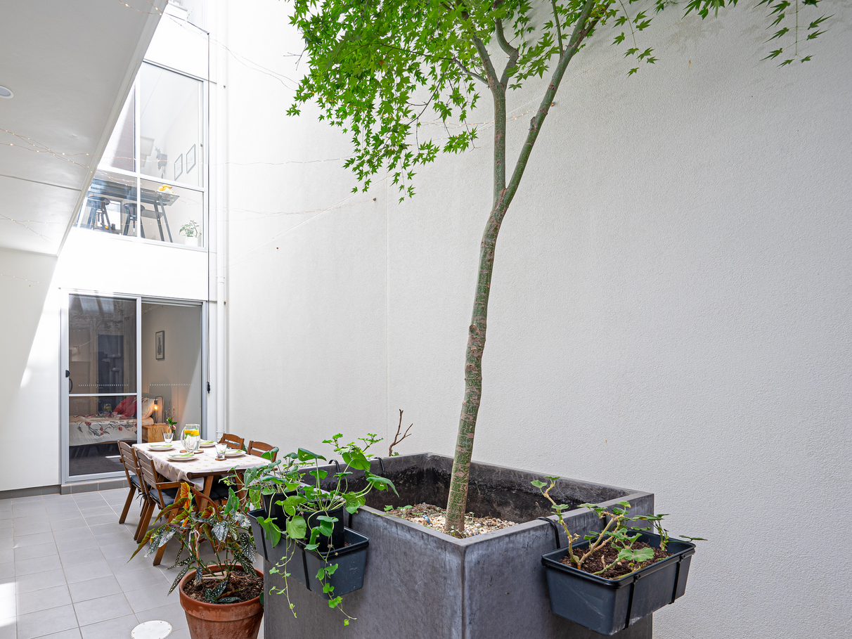 The spacious ground level bedroom offers a discrete living space with walk-in robe and ensuite. Doors open directly onto a central courtyard where you can relax under a mature Japanese Maple tree. An overhead shade sail keeps you cool in summer and easily retracts to let in warm winter light.