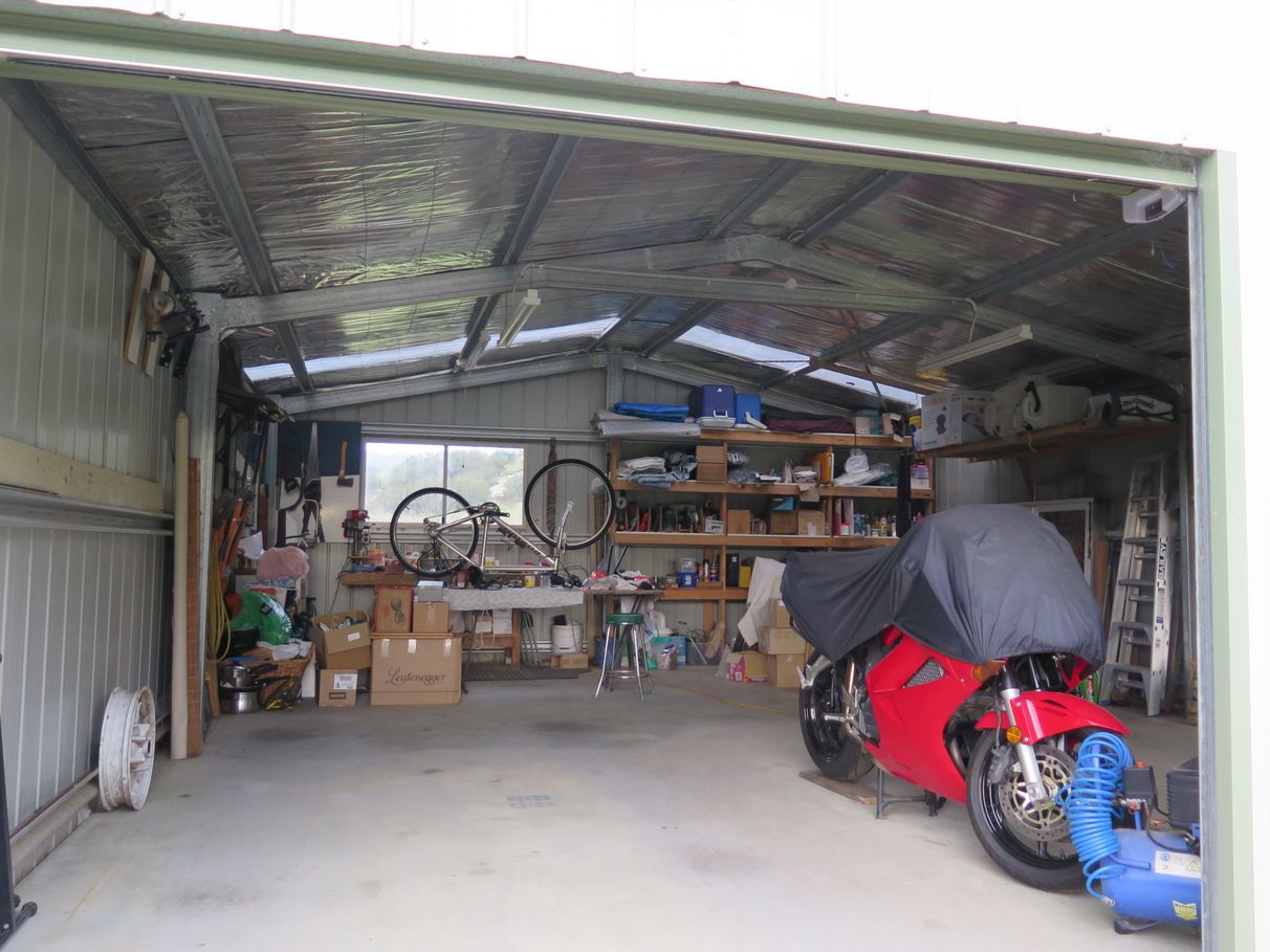 Follow the wide driveway down to a large double garage, size: 8m x 6.5m, with two remote controlled roller doors, 240 volt power and lighting, plenty of built-in shelving for storage and ample room for two cars and bikes, plus a work bench.