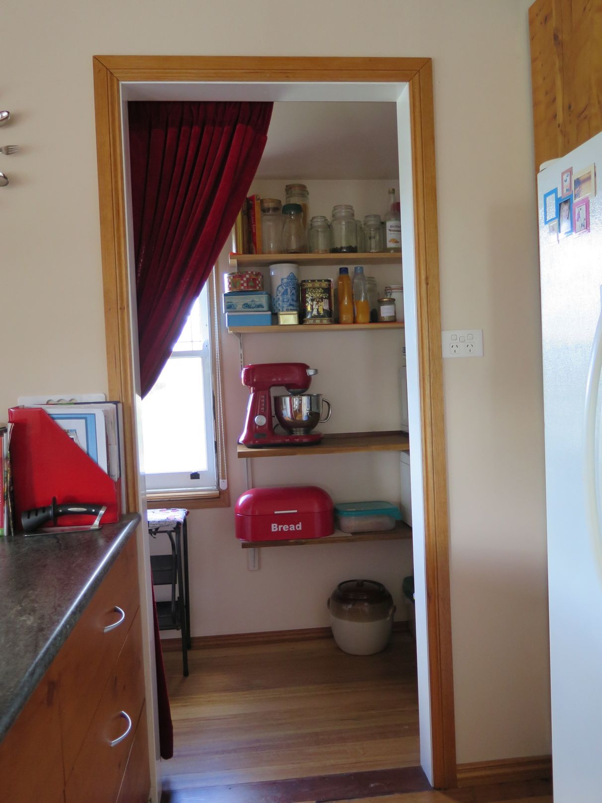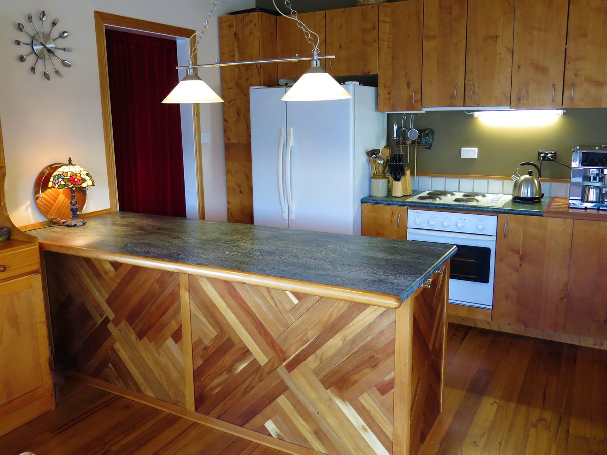 The Tasmanian timber kitchen has superb inlaid woodwork created by a craftsman builder. It boasts a walk-in pantry, large fridge-freezer, electric stove, dishwasher and double sink, with plenty of storage in overhead cupboards as well as easy glide drawers for crockery and pans. All white goods will be included in the sale.