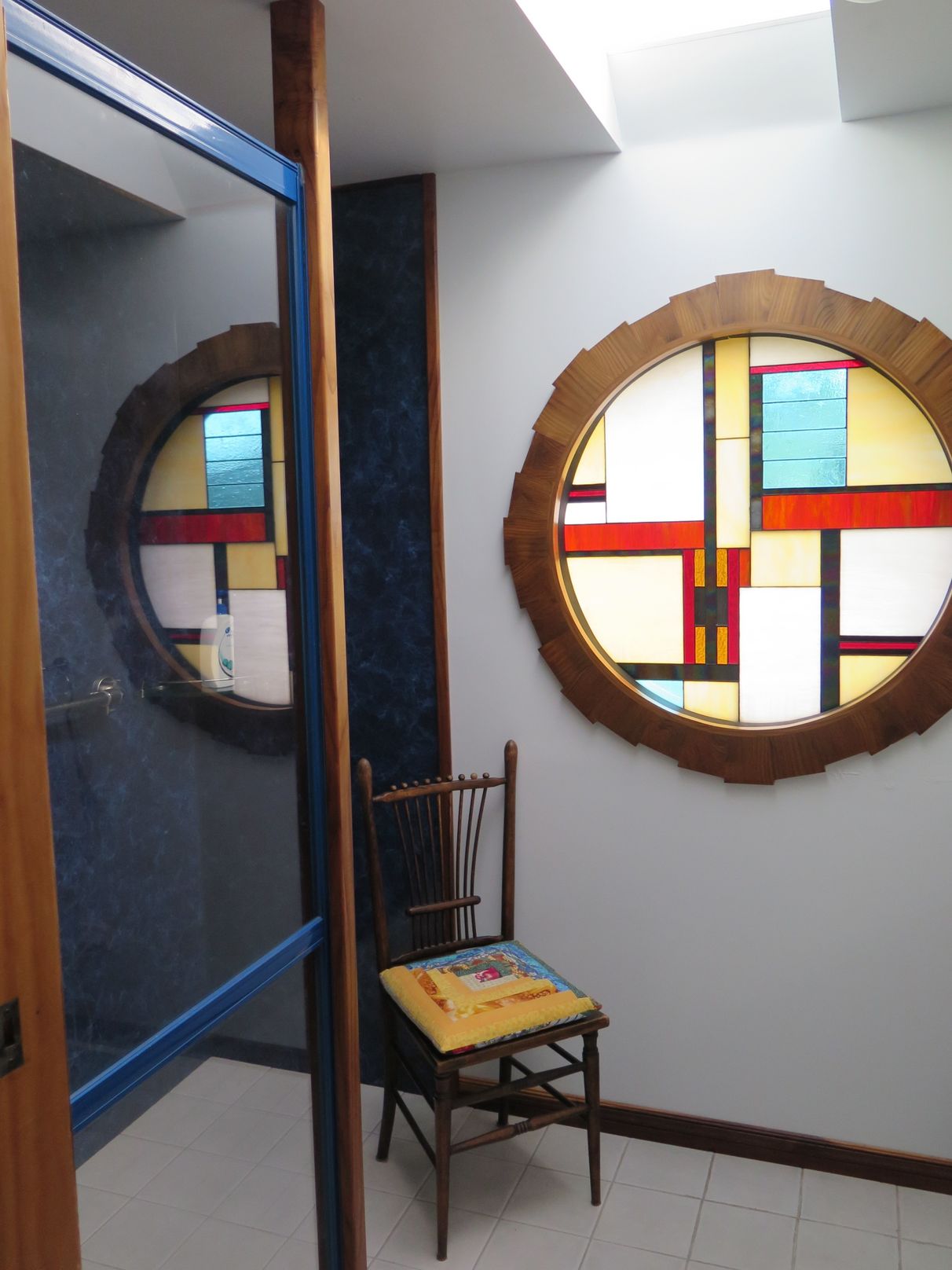 Bathroom with toilet and magnificent round leadlight window, easy access walk-in shower and modern vanity.