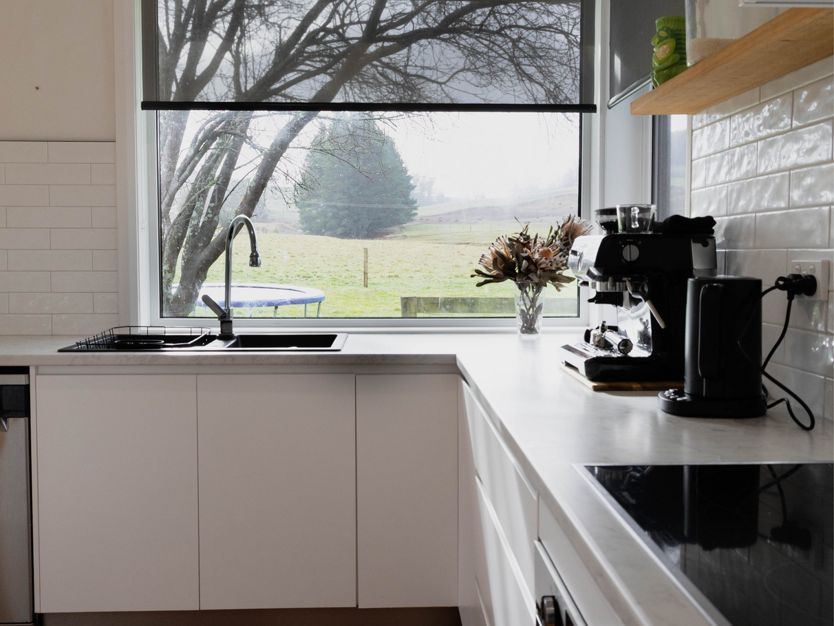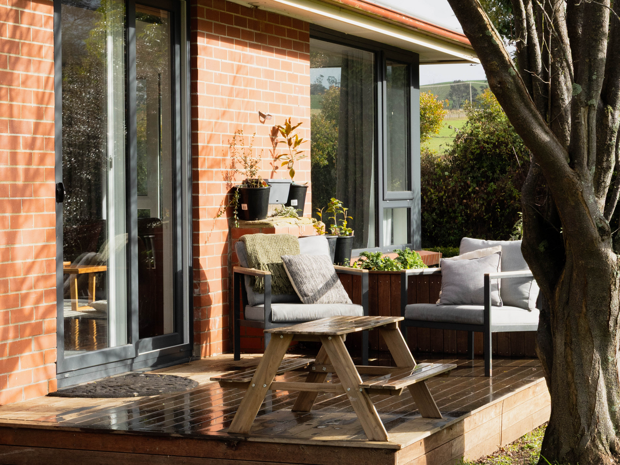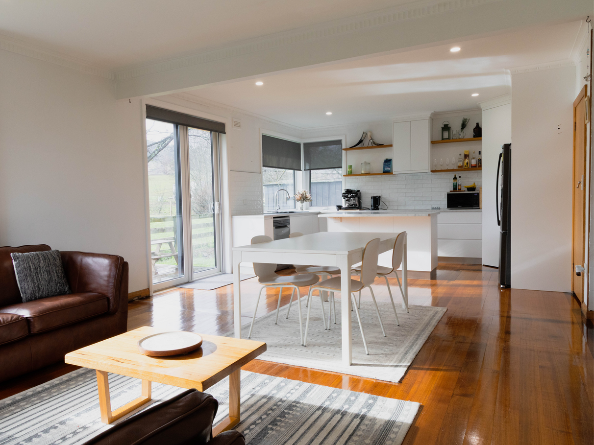 The approx. 7 acres outside features a family friendly fully fenced yard with two fully fenced paddocks. Bring your animals! There is so much water on the property you will never have to worry, with a year-round running creek at the front and a massive dam in the back paddock with all kinds of living things to explore including Patty, our resident platypus. Don’t worry he isn’t shy and will pop his head out to say hi.