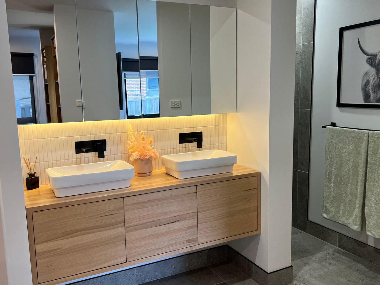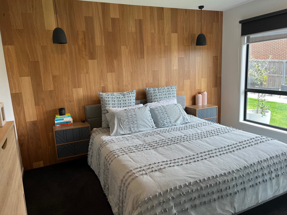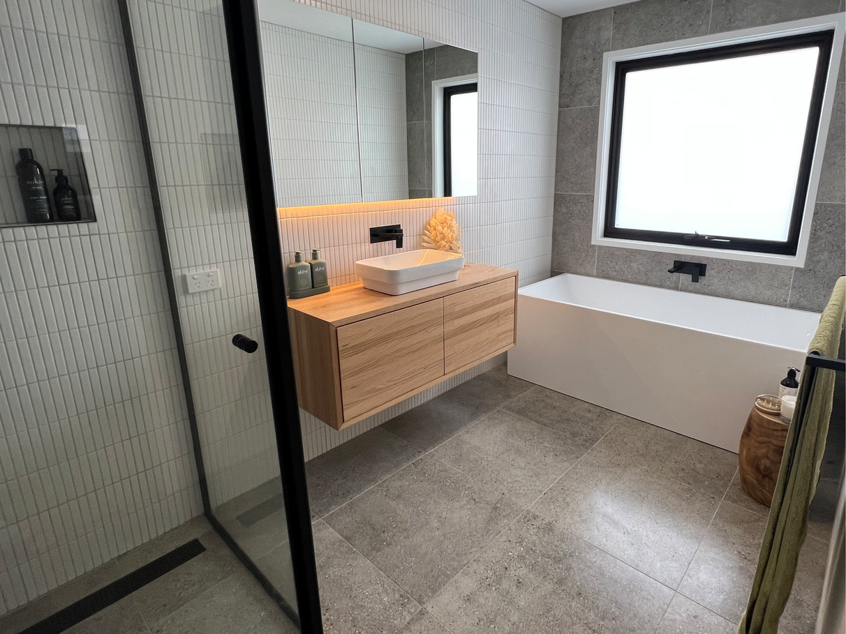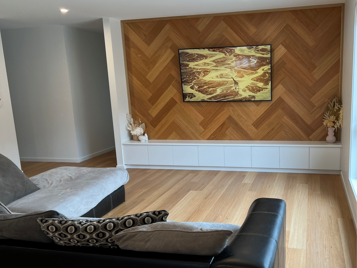 The living room featuring stunning timber wall and built in low line entertainment unit flows onto the dining room for seamless open plan living. The beautiful bathroom features a free standing bath, sleek shower, timber vanity, mirrored shaving cabinets with separate toilet adjacent.