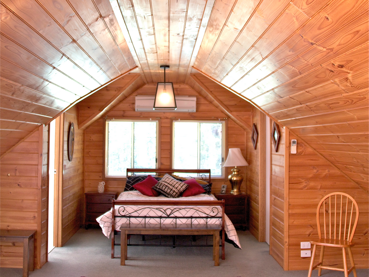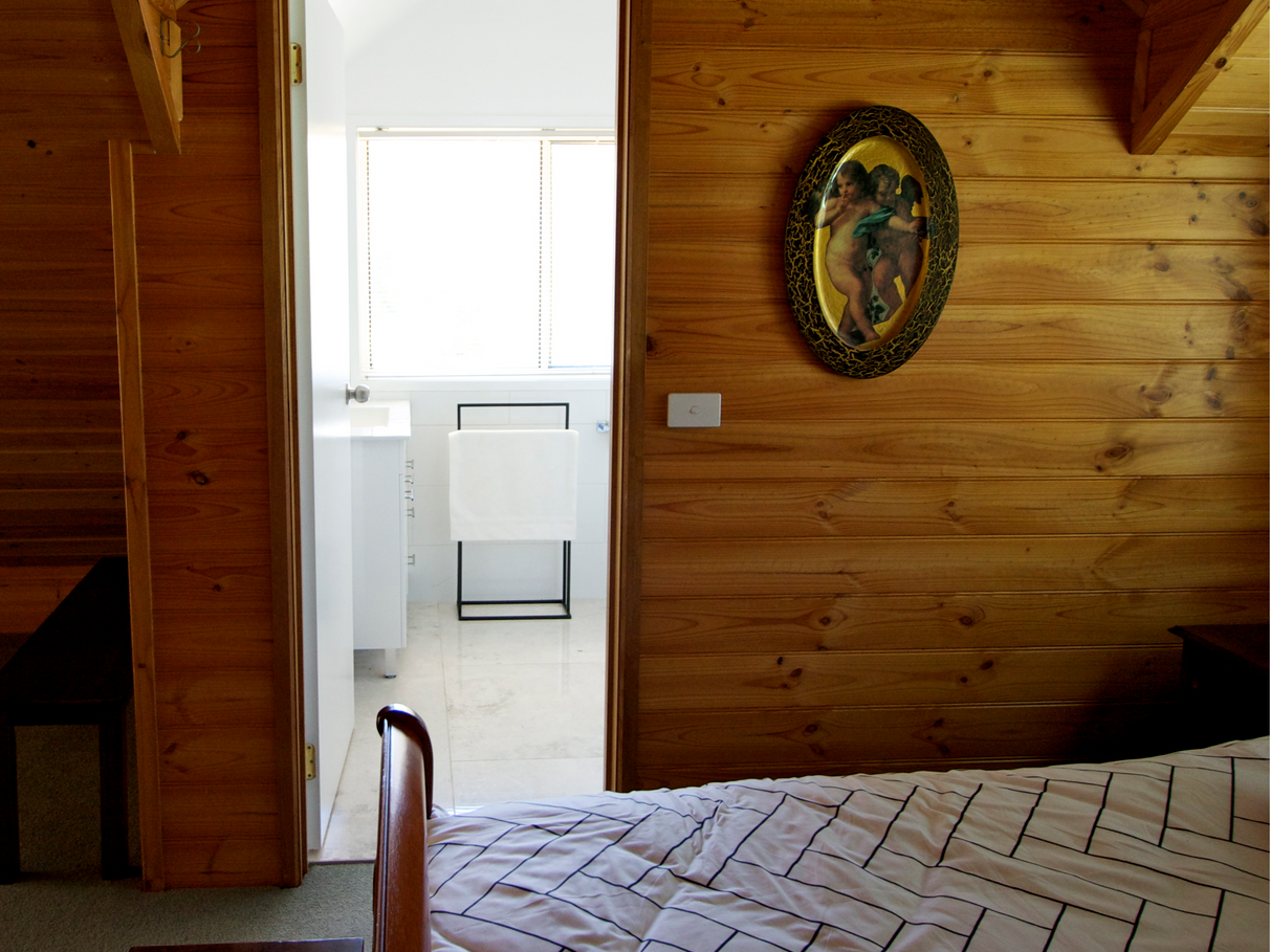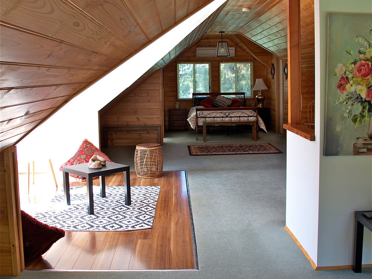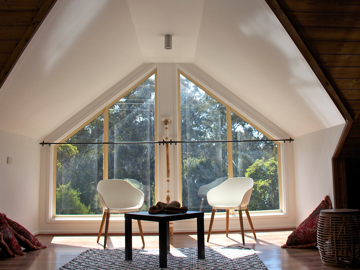 Upstairs is the master bedroom plus surprise living space that spans the entire upstairs of the house, complete with a walk-in robe and modern ensuite. This upstairs space offers a private retreat with generous living areas providing space for music, work, study and pure relaxation. The wall of North facing windows overlooking the treed garden allows the sun to stream in. Meditate up here as you look out over the beautiful treed views in every direction.
