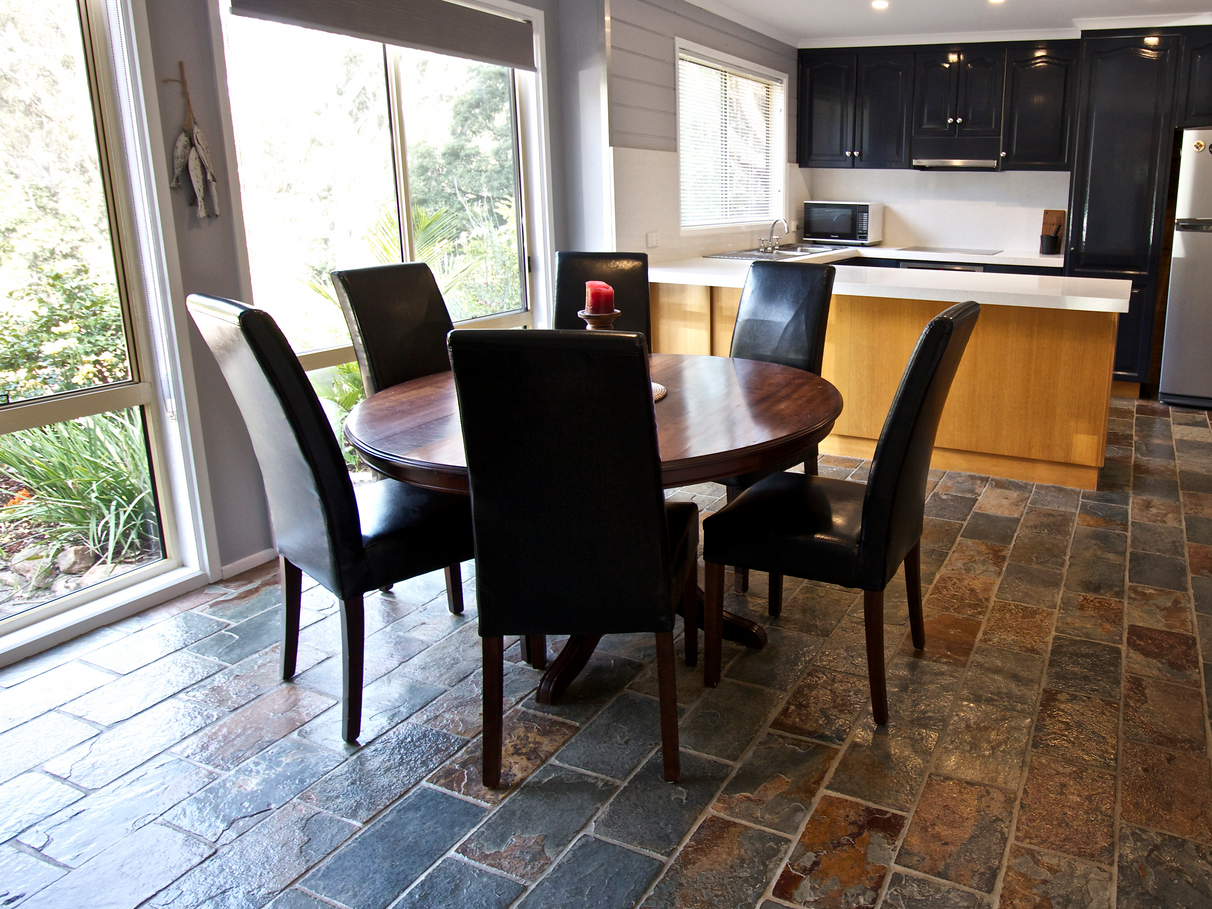 • Design: This home is well-built, a solid construction with meticulous attention to detail and functionality set in enviable natural environs. • Kitchen: The central kitchen features Bosch appliances (electric oven, hotplates and dishwasher), stone bench-tops and generous dining area complete with pleasant earthy slate floor.