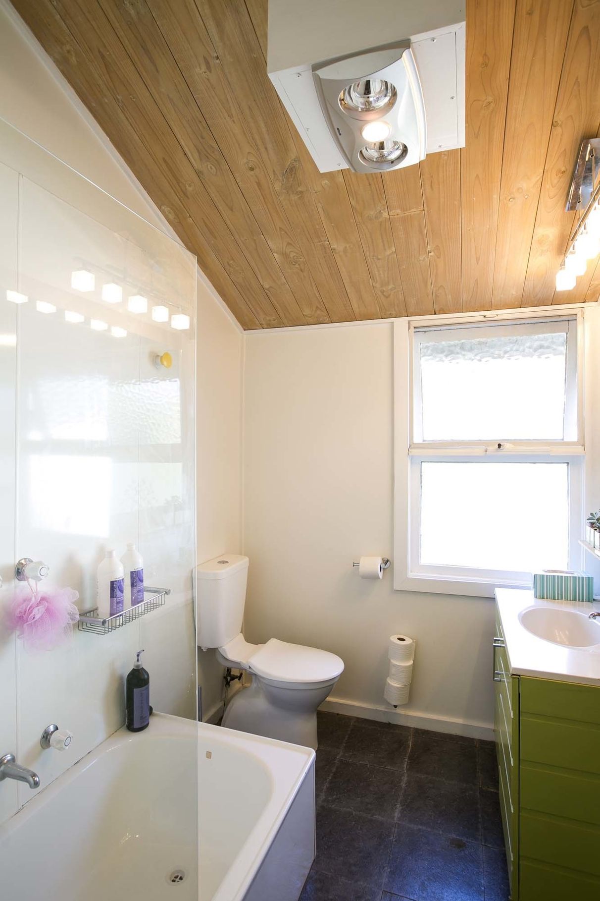 The recently updated, light filled bathroom has a full sized bath and a tastic heat lamp.
