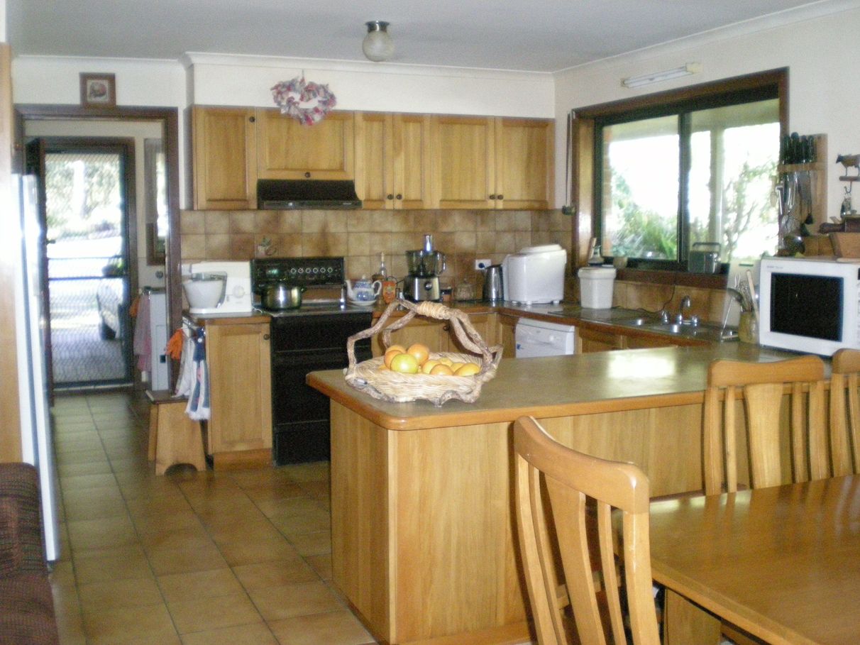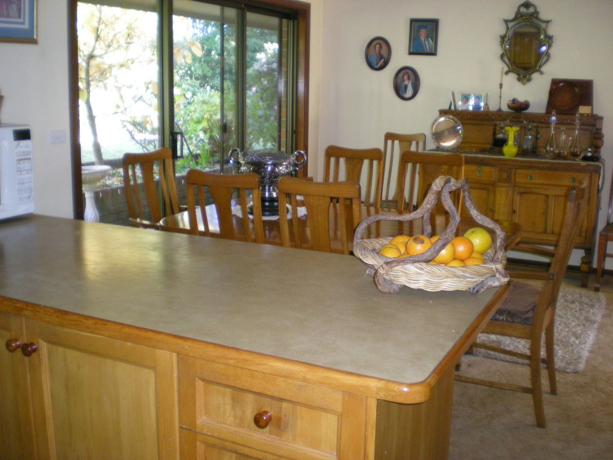 Walking through the carport/outdoor entertainment area we enter the house, where there is a large built in linen cupboard and a laundry, washing machine and hot water service as well as a toilet. In the kitchen surrounded by large, laminated work benches with beautiful timber cupboards, then a double sink, new Dishlex dishwasher, and more bench with cupboards. There are ample pantry cupboards and a refrigerator.