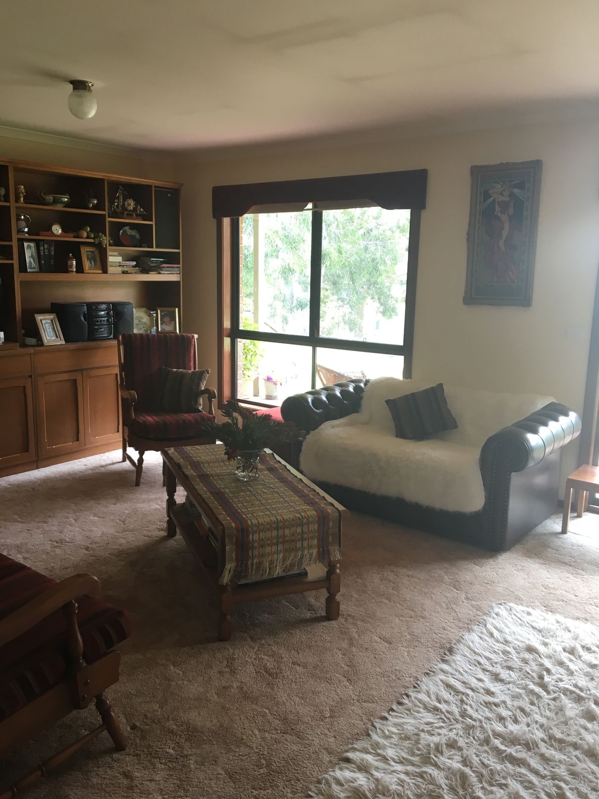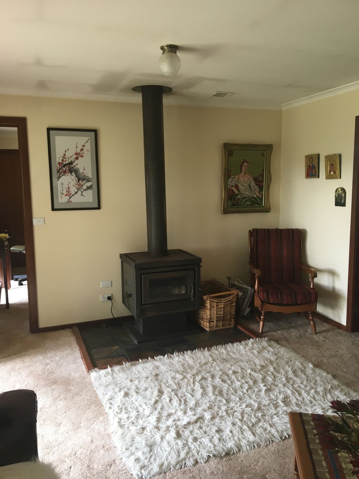 You can either dine on stools at the kitchen bench or at a table in the dining room. There is plenty of space for a large family dining table, sideboard and still have room to move in the dining area. A sliding door leads to the lounge room. In the lounge room there is a very effective wood fire, which in winter warms the whole house beautifully, the heat can be ducted through the ceiling to be discharged through vents at either end of the house.